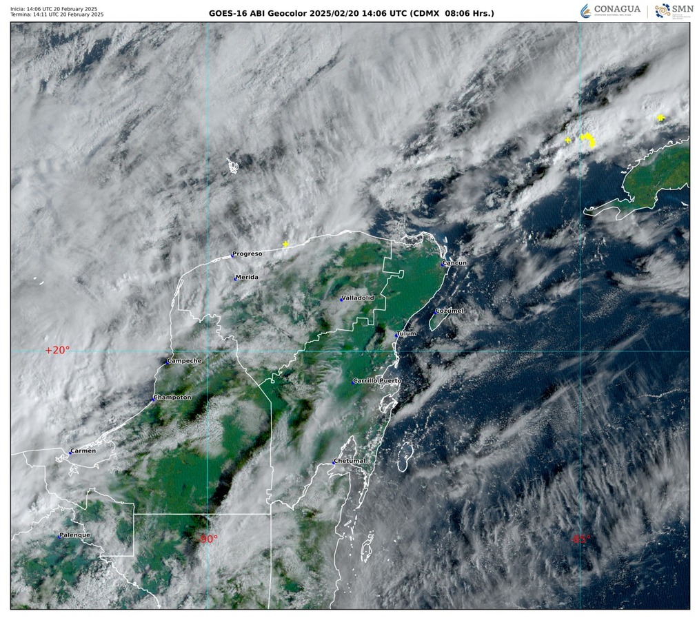 De manera general, el frente frío No. 28 se extenderá sobre la porción norte de la península de Yucatán y originará cielo nublado con lluvias fuertes y puntuales muy fuertes, de 50 a 75 mm, acompañadas de actividad eléctrica, en Quintana Roo.