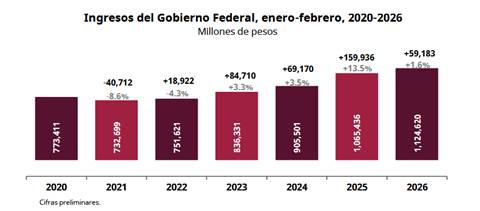 La cifra registrada indica un incremento nominal de 59 mil 183 millones de pesos frente a lo contabilizado al segundo mes del año anterior, con lo que se supera en 102.7% lo programado por la Ley de Ingresos de la Federación 2026 para este periodo.