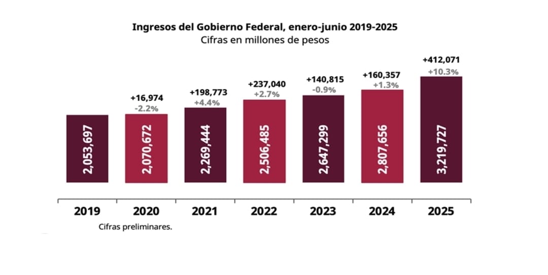 De ese monto, 2 billones 835 mil 993 millones de pesos provienen de la recaudación tributaria obtenida en los primeros seis meses del año, lo que representa un crecimiento real de 7.9% respecto al primer semestre de 2024.
