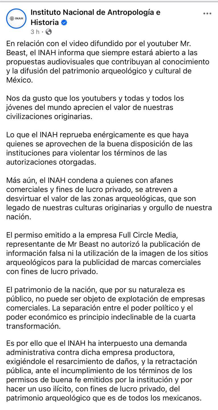 En un boletín difundido en su página, la noche de este miércoles, el Instituto Nacional de Antropología e Historia condenó –refiriéndose a MrBeast– “a quienes con afanes comerciales y fines de lucro privado, se atreven a desvirtuar el valor de las zonas arqueológicas, que son legado de nuestras culturas originarias y orgullo de nuestra nación”.
