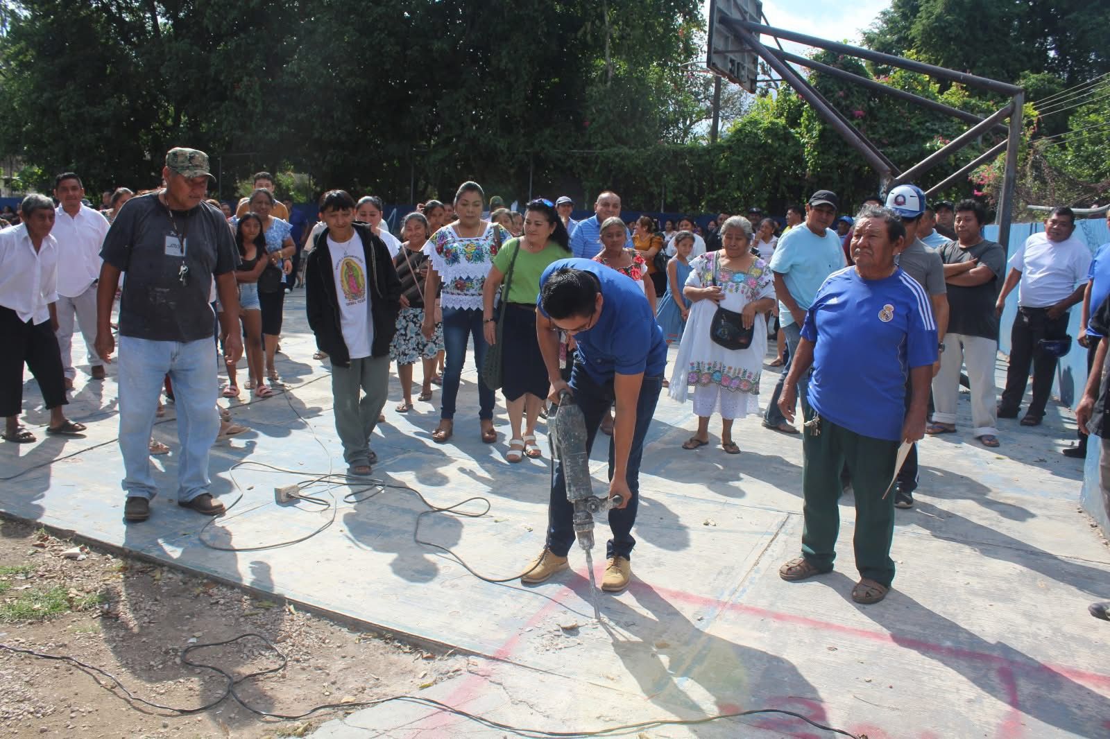 CHEMAX, YUC. a 9 enero.- El alcalde Ricardo Balam Chi, en compañía de sus regidores, directores del ayuntamiento y los vecinos de la colonia Centro, dieron el banderazo de inicio de la “construcción de techado” en espacio multideportivo de la cancha Solidaridad, ubicado sobre la calle 19 x 24 y 26 de dicha colonia.