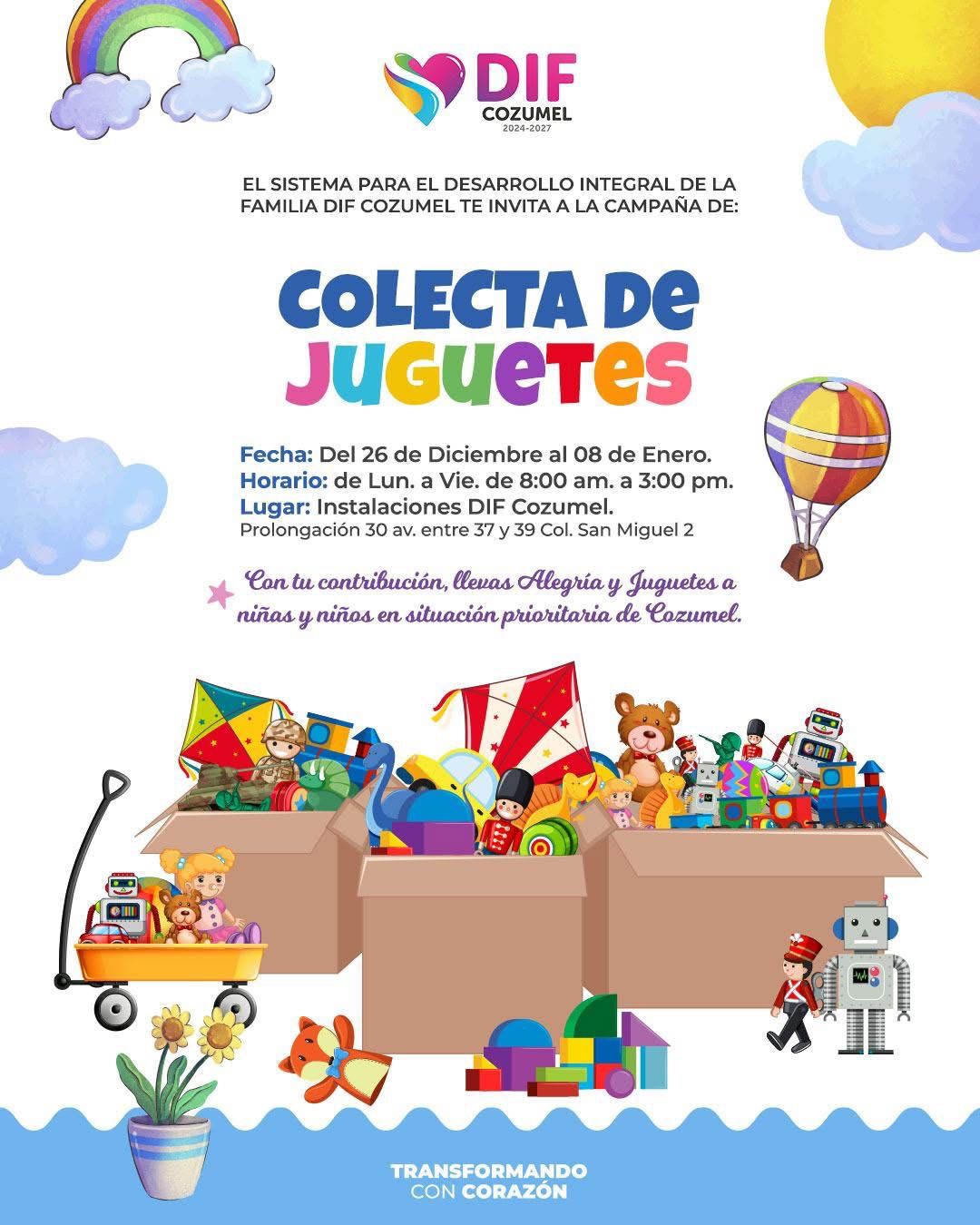 Dijo que esta colecta se llevará a cabo del 26 de diciembre al 8 de enero, por lo que hace una atenta invitación a todas las personas que quieran sumarse, donando juguetes y bolsas de dulces, mismos que pueden ser entregados en las instalaciones del Sistema DIF Cozumel, ubicadas en la 30 Av. Entre 37 y 39, en la colonia San Miguel 2, de lunes a viernes de 8 de la mañana a 3 de la tarde.