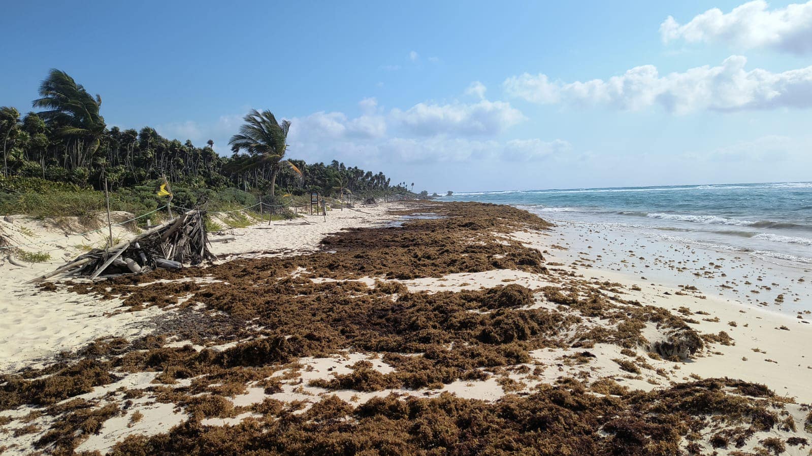 Los vientos intensos y secos de hasta 60 kilómetros por hora que afectaron al Golfo de México y la Península de Yucatán, hicieron que desde el sábado más de 450 kilómetros de costa amanecieran con enormes cantidades de alga marina, desde Punta Nizuk, Cancún, hasta Xcalak, en la Costa Maya del sur del estado, lo que incluye el litoral oriente de la isla de Cozumel.