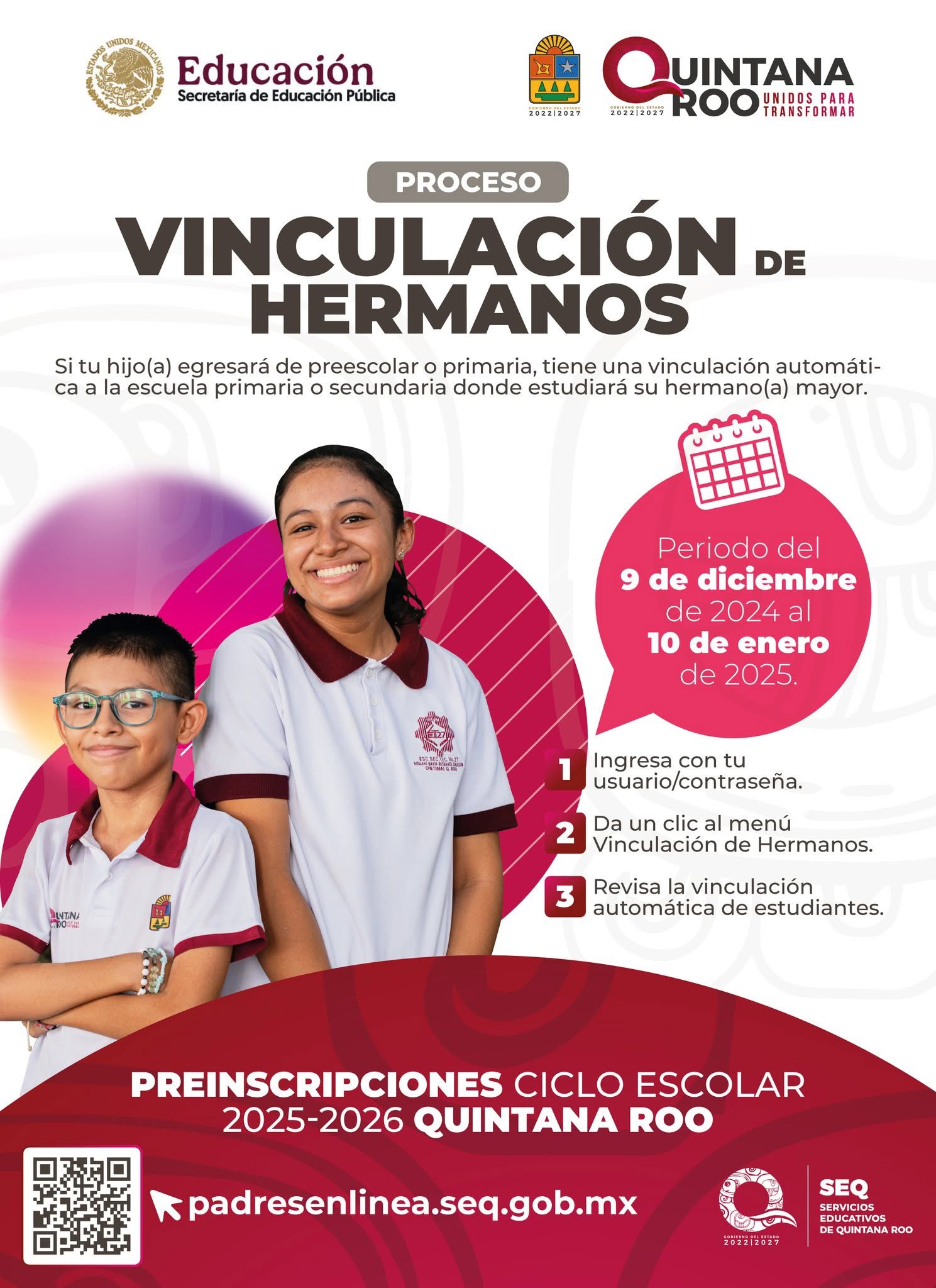 CANCÚN, Q.ROO, 16 de diciembre.- Desde el 09 de diciembre del año en curso y hasta el 10 de enero de 2025, la Secretaría de Educación de Quintana Roo (SEQ) mantendrá abierto el periodo para validar la vinculación automática de hermanos que ingresarán a primaria o secundaria en el ciclo escolar 2025-2026.