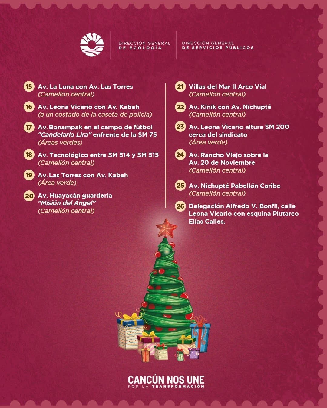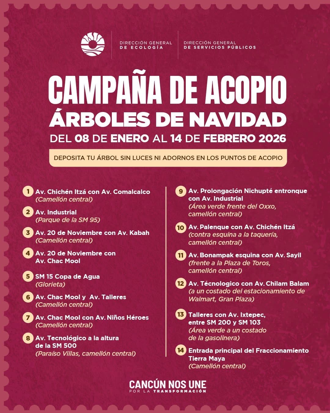A partir de este 8 de enero, el Ayuntamiento de Benito Juárez, a través de la Dirección General de Ecología, instaló 26 módulos de acopio de árboles de Navidad naturales en distintos puntos de la ciudad, como parte de una estrategia ambiental para promover el manejo responsable de residuos sólidos y reducir el impacto negativo de la temporada decembrina en el entorno urbano.