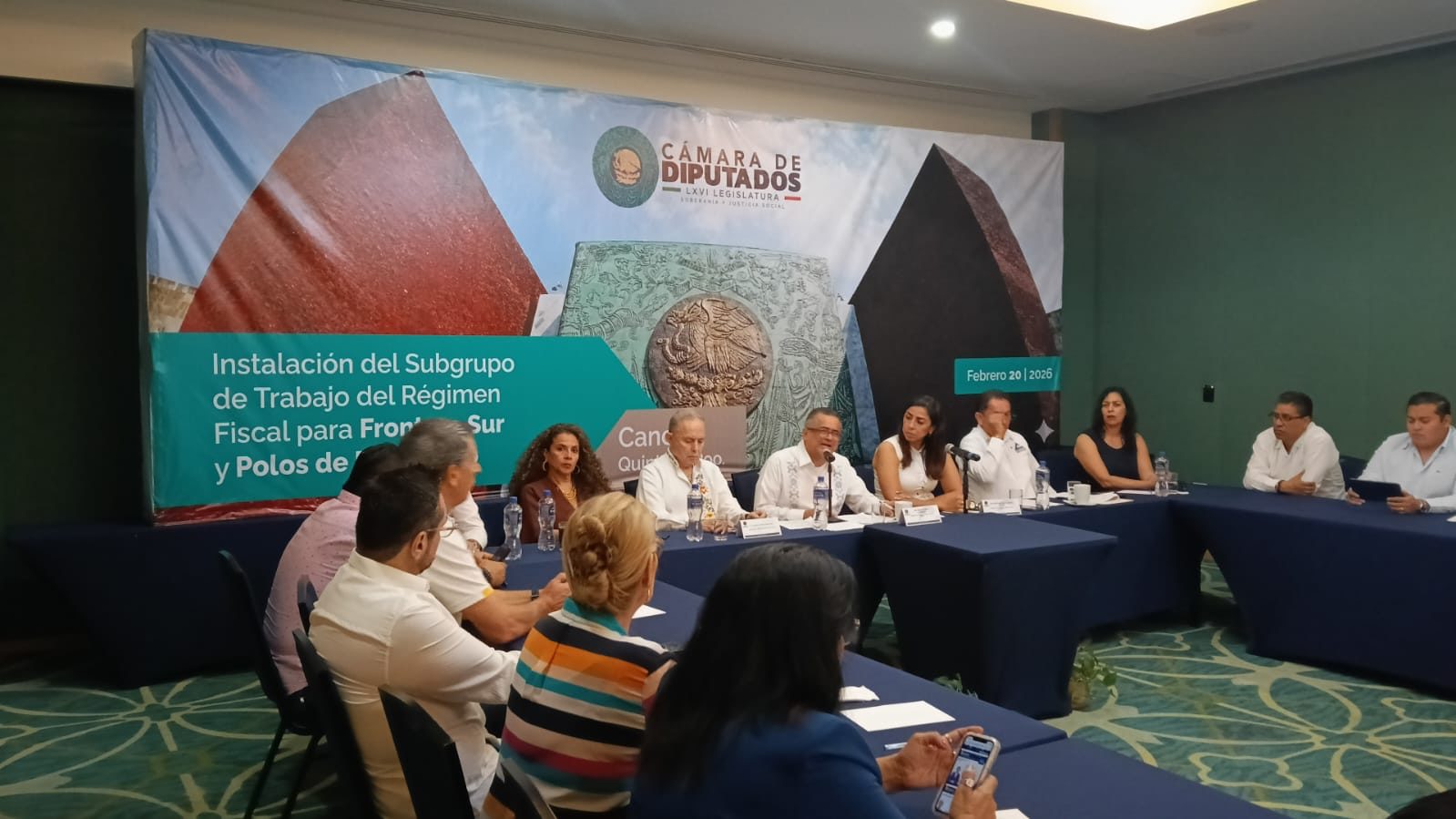 Cancún, Quintana Roo, 20 de Febrero del 2026.- El legislador Carol Antonio Altamirano, quien encabeza la Comisión de Hacienda y Crédito Público en la Cámara de Diputados, presidió en Cancún la conformación de un equipo técnico que analizará el esquema tributario vigente en la frontera sur y en los llamados polos de desarrollo estratégico.