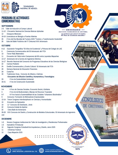 En noviembre, las actividades continuarán con el II Foro de Ciencias Sociales, Economía Social y Solidaria, el Foro de Ingeniería en Manejo de Recursos Naturales, y el Congreso de Ingeniería Bioquímica 2025, centrado en biotecnología y sustentabilidad. A ello se suman la Carrera Atlética 50 Aniversario, el Congreso Nacional de Estudiantes de Ciencias Sociales y Humanidades, y el Festival de Cultura Ambiental y Artes Escénicas.