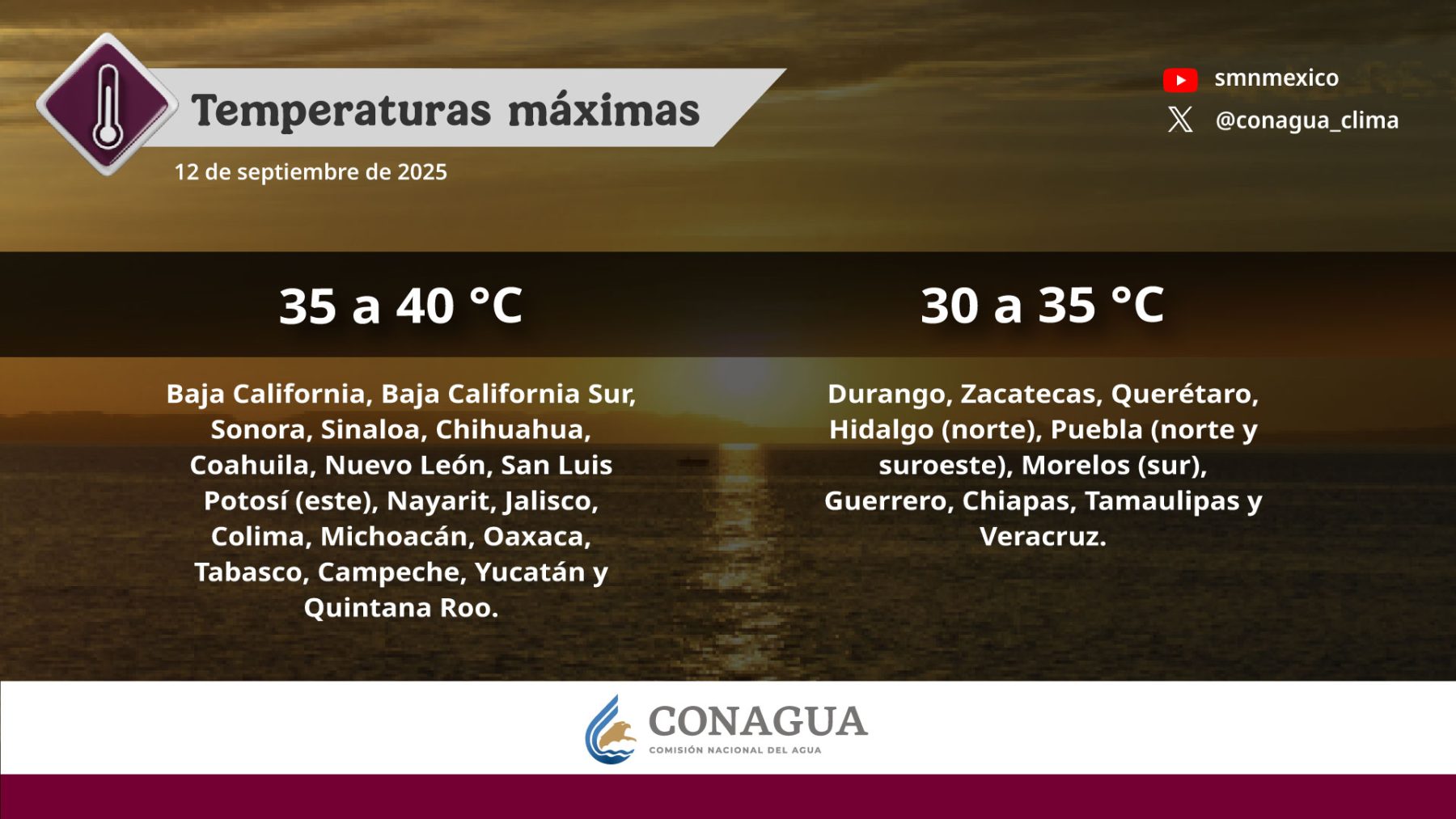 Pese a las condiciones de tormenta, el ambiente diurno continuará siendo cálido a caluroso, con temperaturas máximas que podrían superar los 35 °C en Campeche, Yucatán y Quintana Roo, además de Tabasco, Oaxaca y regiones del litoral del Pacífico.