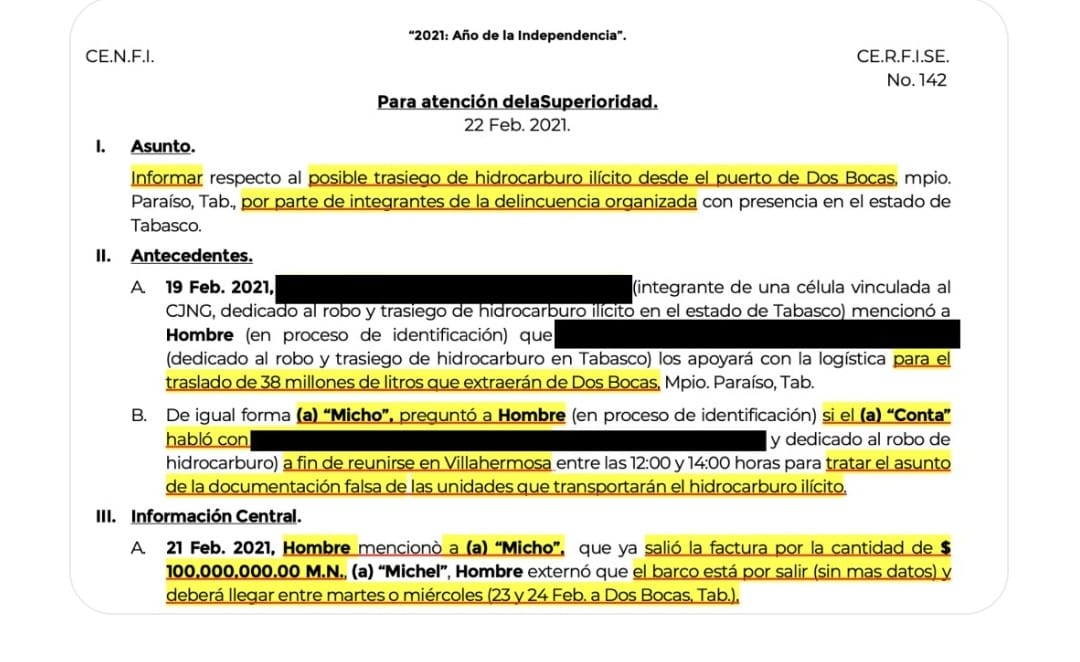 Uno de los informes militares, fechado el 22 de febrero de 2021, menciona sobre los planes de un grupo delictivo para extraer 38 millones de litros de combustible de un barco que estaba por llegar al puerto de Dos Bocas. En ese informe se hace alusión a dos traficantes de apellido Ovando que apoyarían en la logística y en obtener documentación falsa para las unidades que transportarían el hidrocarburo. Junto al puerto se construía en ese momento la refinería Olmeca, por lo que había constante presencia militar en la zona.