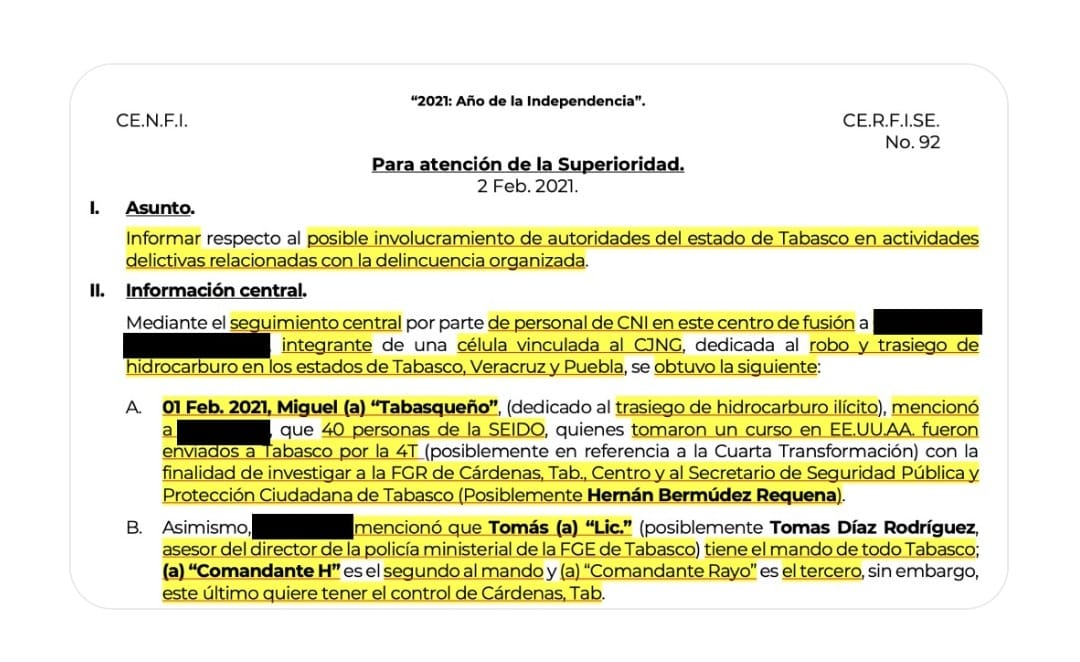 “…que 40 personas de la SEIDO “Subprocuraduría Especializada en Investigación de Delincuencia Organizada), quienes tomaron un curso en Estados Unidos, fueron enviados a Tabasco por la 4T con la finalidad de investigar a la FGR de Cárdenas, Tabasco, Centro y al Secretario de Seguridad Pública Ciudadana de Tabasco (posiblemente Hernán Bermúdez Requena)”, se lee textual en el informe oficial.