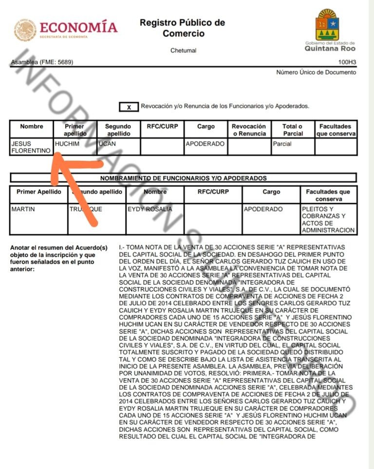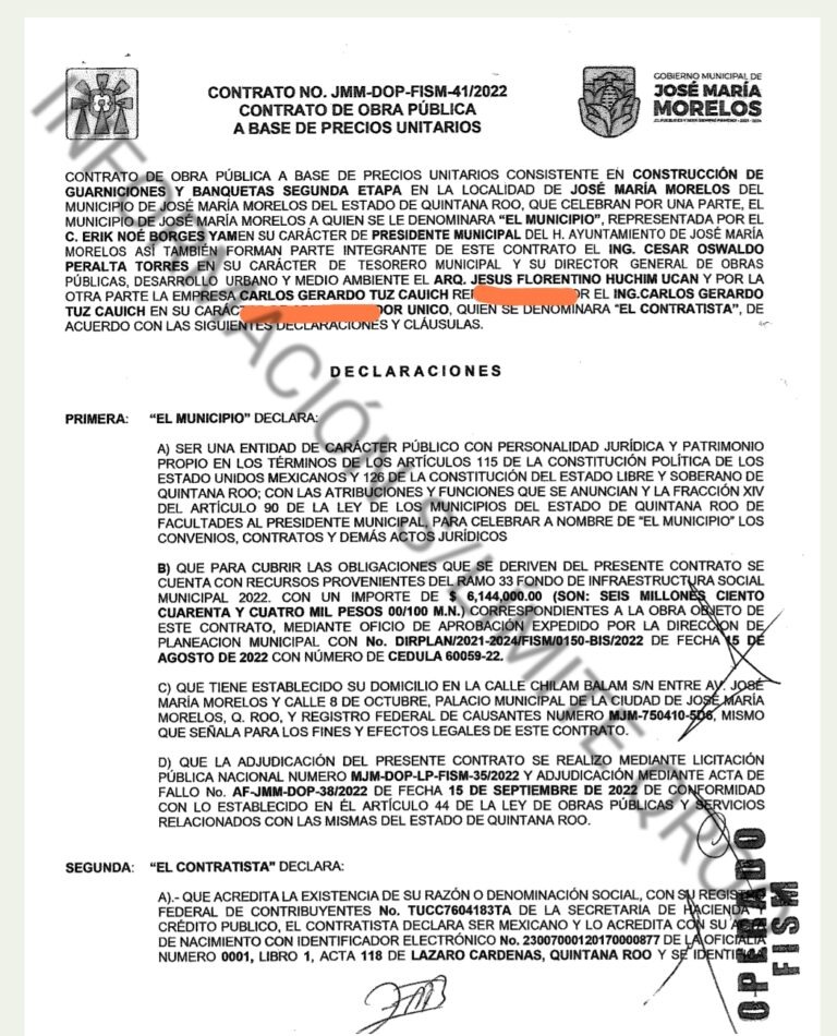 La carpeta de investigación FECC/QROO/DS/29/02/2025, respaldada con documentos y contratos, expone una red de adjudicaciones que, según la denuncia, benefició de manera directa a empresas vinculadas a funcionarios en activo. El caso más señalado es el de Jesús Florentino Huchim Ucán, quien habría entregado más de 11 contratos de obra pública, por un monto superior a 20 millones 757 mil pesos, a su socio Gerardo Tuz Cauich entre 2022 y 2024