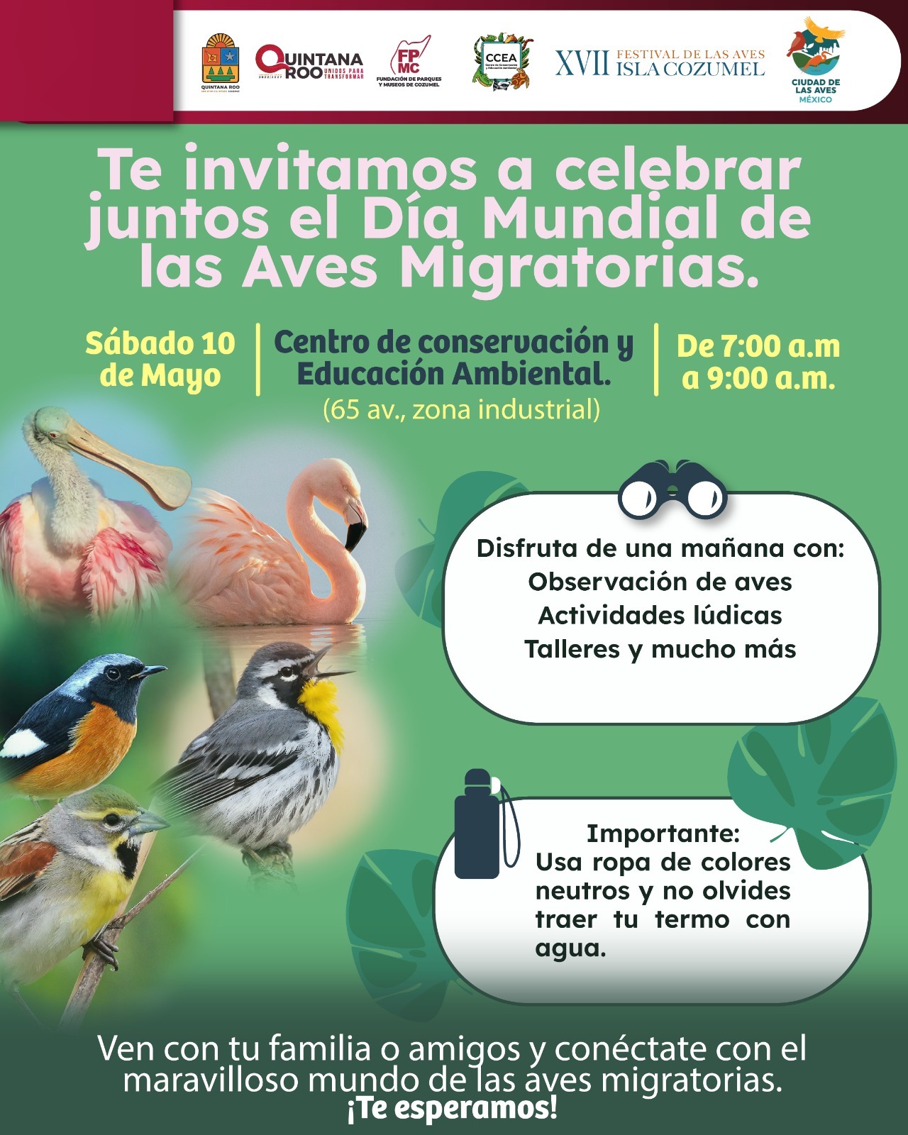 Por su parte, el director de Conservación y Educación Ambiental (CEA), Rafael Chacón Díaz, explicó que el Día Mundial de las Aves Migratorias se celebra dos veces al año: el segundo sábado de mayo, cuando las aves migran hacia sus zonas de anidación, y en octubre, cuando retornan a sus lugares de invernada. Precisó que estos periodos son ideales para observar aves migratorias en Cozumel, por lo que la jornada representa una oportunidad única para conectar con la naturaleza.