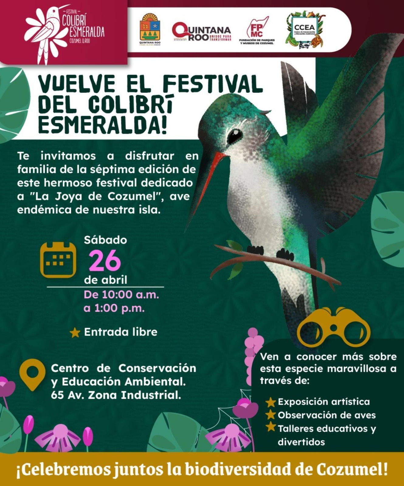 Cozumel.– La Fundación de Parques y Museos de Cozumel (FPMC) convoca a la comunidad a participar en la séptima edición del Festival del Colibrí Esmeralda, que se llevará a cabo el próximo sábado 26 de abril, de las 10:00 a las 13:00 horas, en el Centro de Conservación y Educación Ambiental (CCEA), ubicado en la avenida 65, zona industrial.