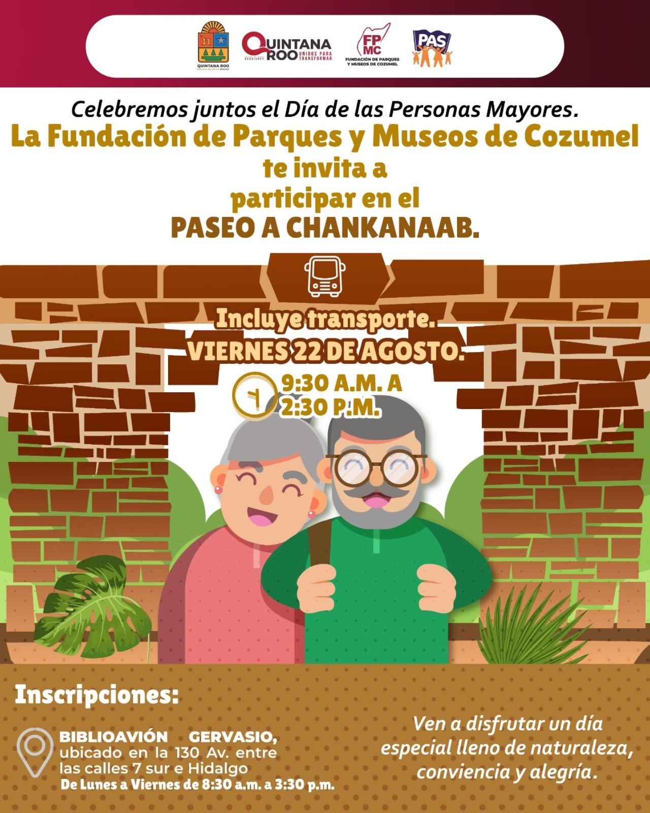 Cozumel.– La Fundación de Parques y Museos de Cozumel (FPMC) invita a las personas adultas mayores a disfrutar del “Paseo a Chankanaab”, una actividad especial para celebrar su día, que se realizará el viernes 22 de agosto, de 09:30 a 14:30 horas.