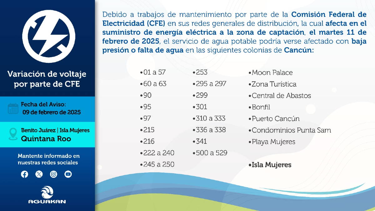 A través de un aviso publicado en sus redes oficiales, Aguakan informa que la Comisión Federal de Electricidad (CFE) proporcionará mantenimiento a sus redes generales de distribución, trabajos que afectarán el suministro de energía eléctrica en la zona de captación.