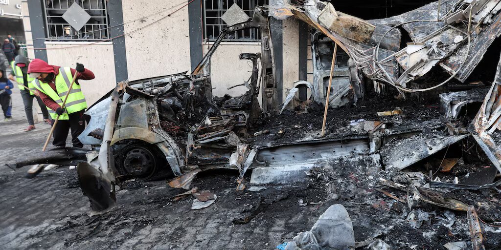 Dos miembros de la Defensa Civil extinguen un incendio en una furgoneta tras un ataque israelí cerca del hospital Al-Awda, en Nuseirat, Franja de Gaza. 26 diciembre 2024. REUTERS/Khamis Said