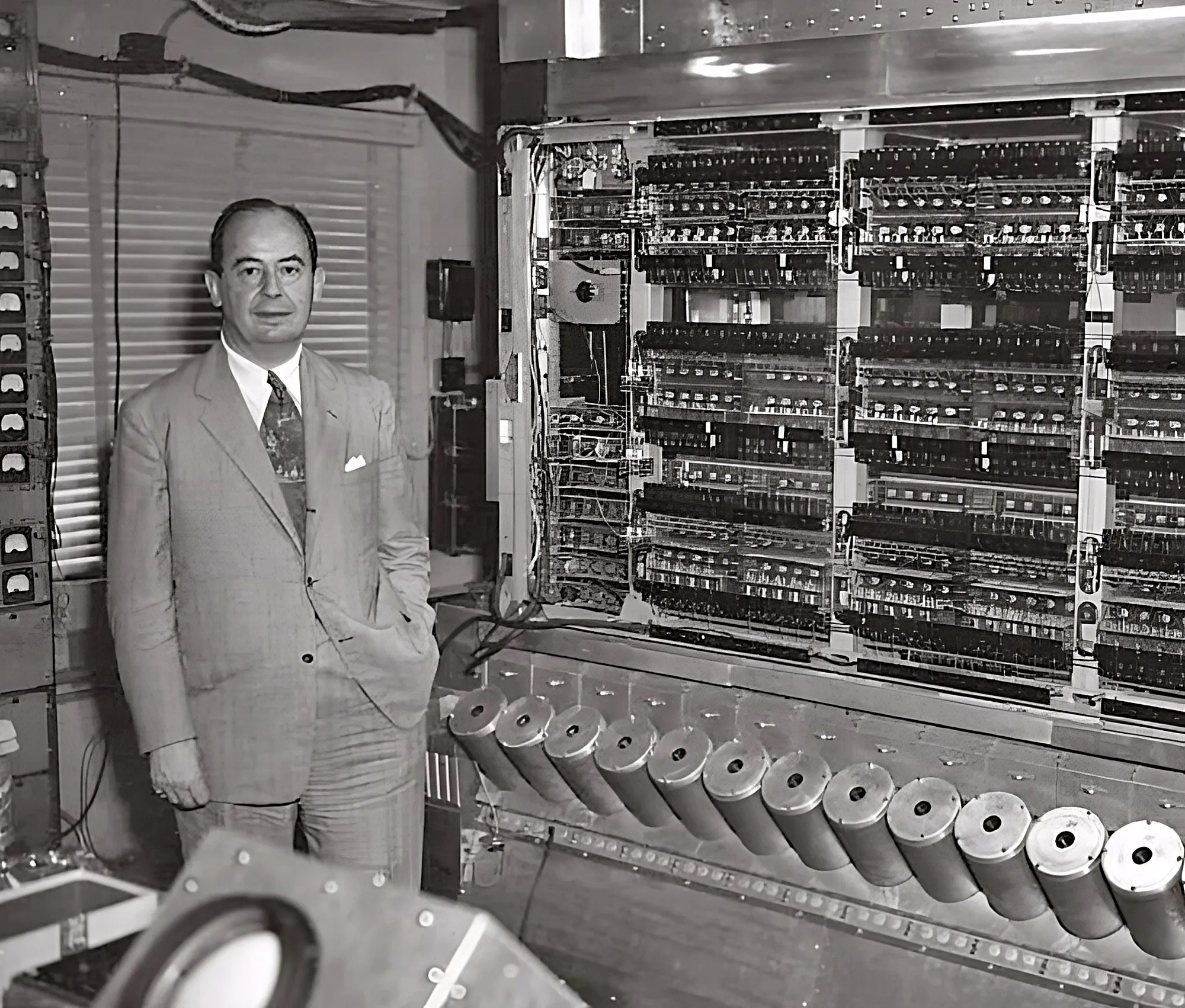 Pero sus contribuciones no fueron meramente teóricas. Von Neumann trabajó en la construcción de la EDVAC, una de las primeras computadoras electrónicas programables, y planteó ideas que anticiparon tecnologías como la inteligencia artificial y los algoritmos avanzados. Su capacidad para visualizar soluciones revolucionarias convirtió a la computación en un área interdisciplinaria donde matemáticas, ingeniería y lógica convergían.