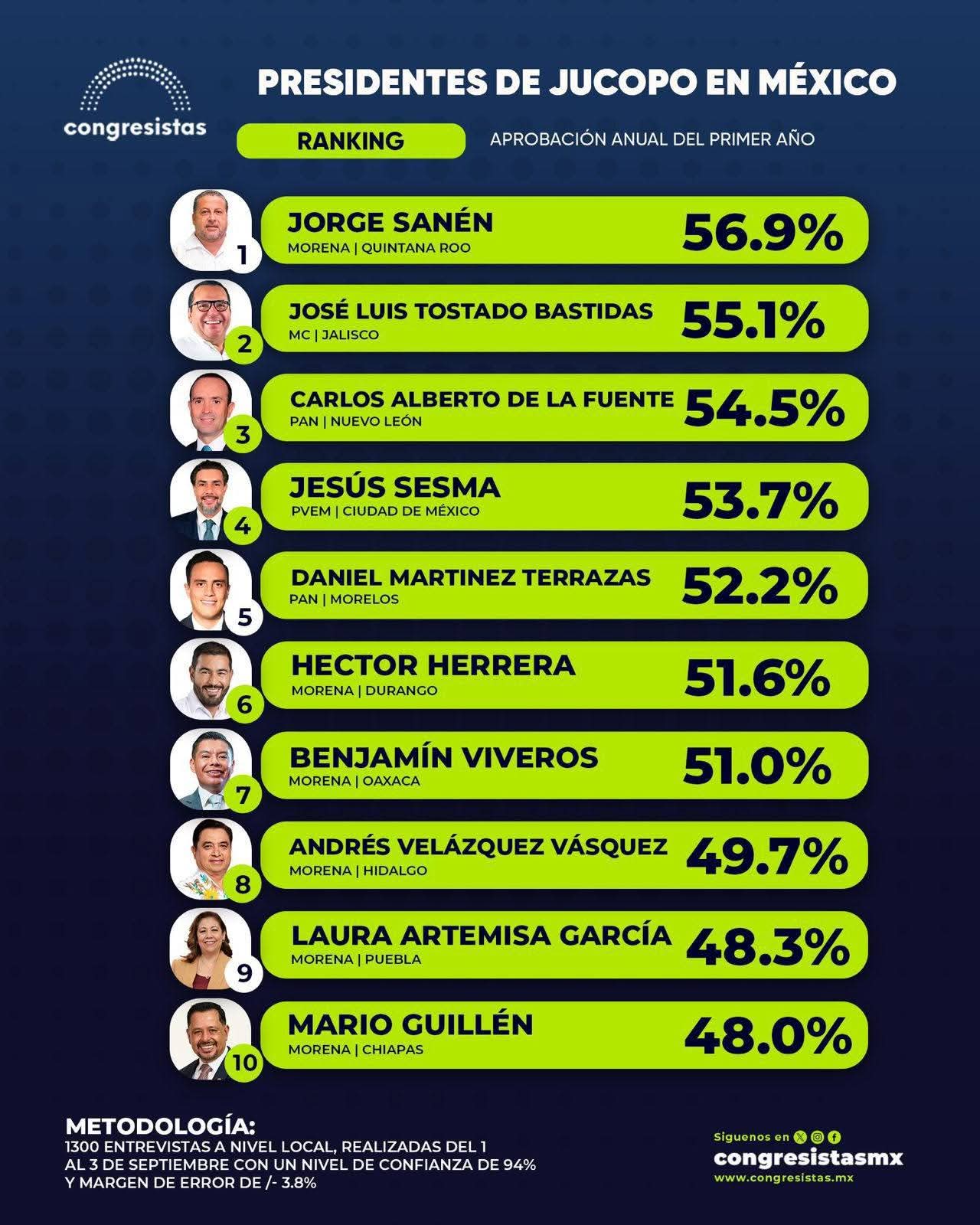 En el Ranking Jugocopo 2025, Votantes presentó el ranking de aprobación anual de presidentes de Jucopo en México encabezada por Jorge Sanén Cervantes de Morena, en Quintana Roo con 56.9 %. La Metodología fue de 1,300 entrevistas a nivel local, realizadas del 1 al 3 de agosto; nivel de confianza 94 % y margen de error ±3.8 %.