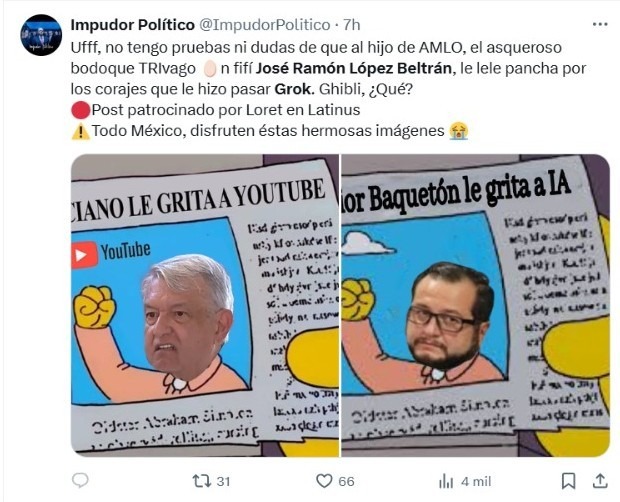 En la misma red social, uno de los usuarios comparó la confrontación entre López Beltrán y Grok con la vez en que el expresidente López Obrador discutió con YouTube, luego de que la plataforma de streaming despublicó diversos videos de la conferencia La Mañanera por mostrar los datos de una reportera del New York Times.