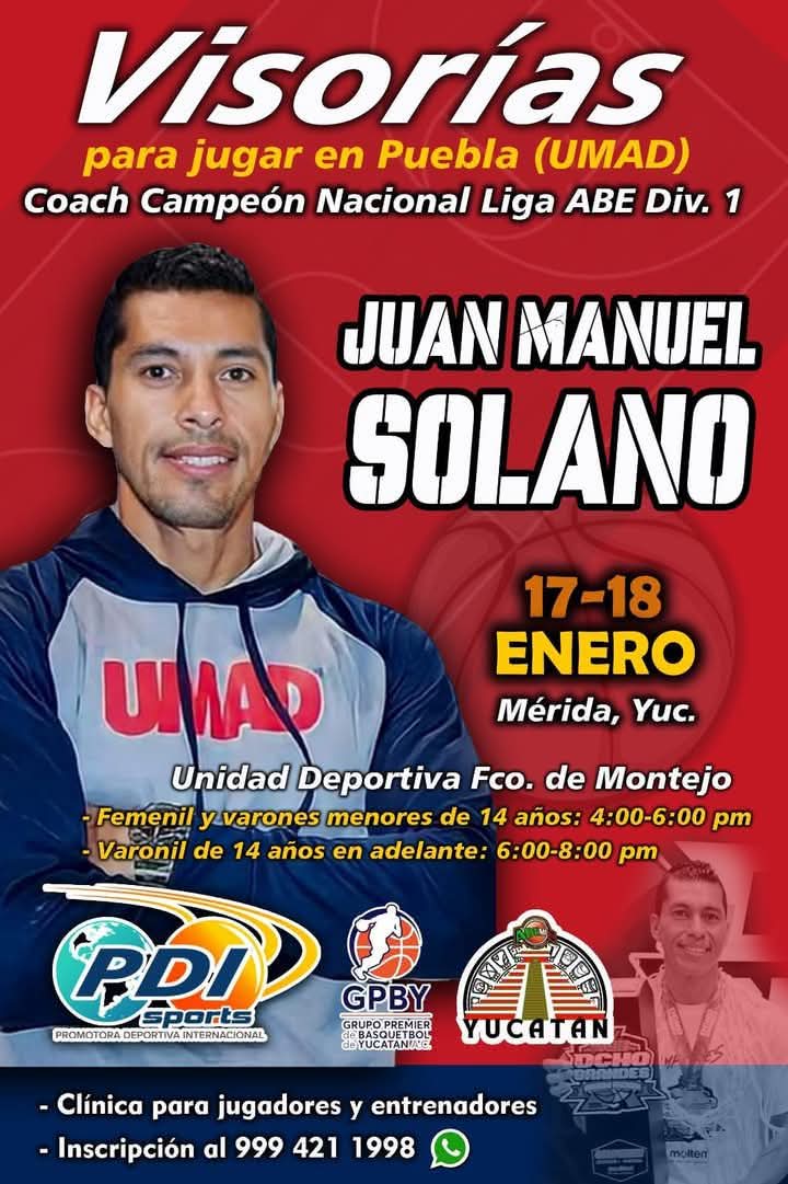 ► Los días 17 y 18 de enero se realizará una clínica de básquetbol impartida por el coach Juan Manuel Solano Cabrera, en donde estará visoreando al talento del deporte ráfaga en Yucatán