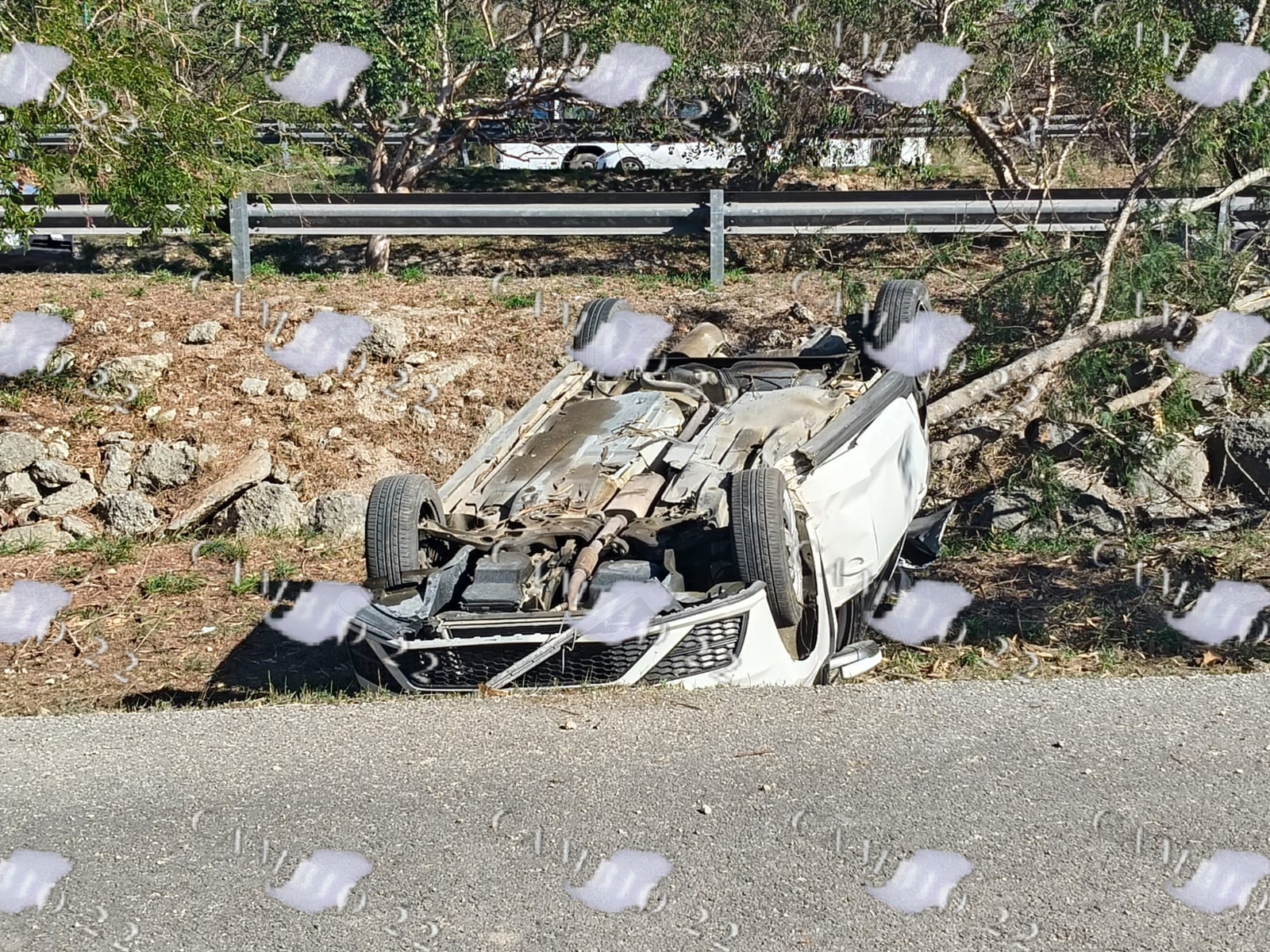Tras pasar una curva, por presuntamente conducir a exceso de velocidad, el conductor perdió el control del volante, provocando que el auto se saliera de la vía y se estrellará contra un árbol para después quedar con las cuatro llantas hacía arriba.