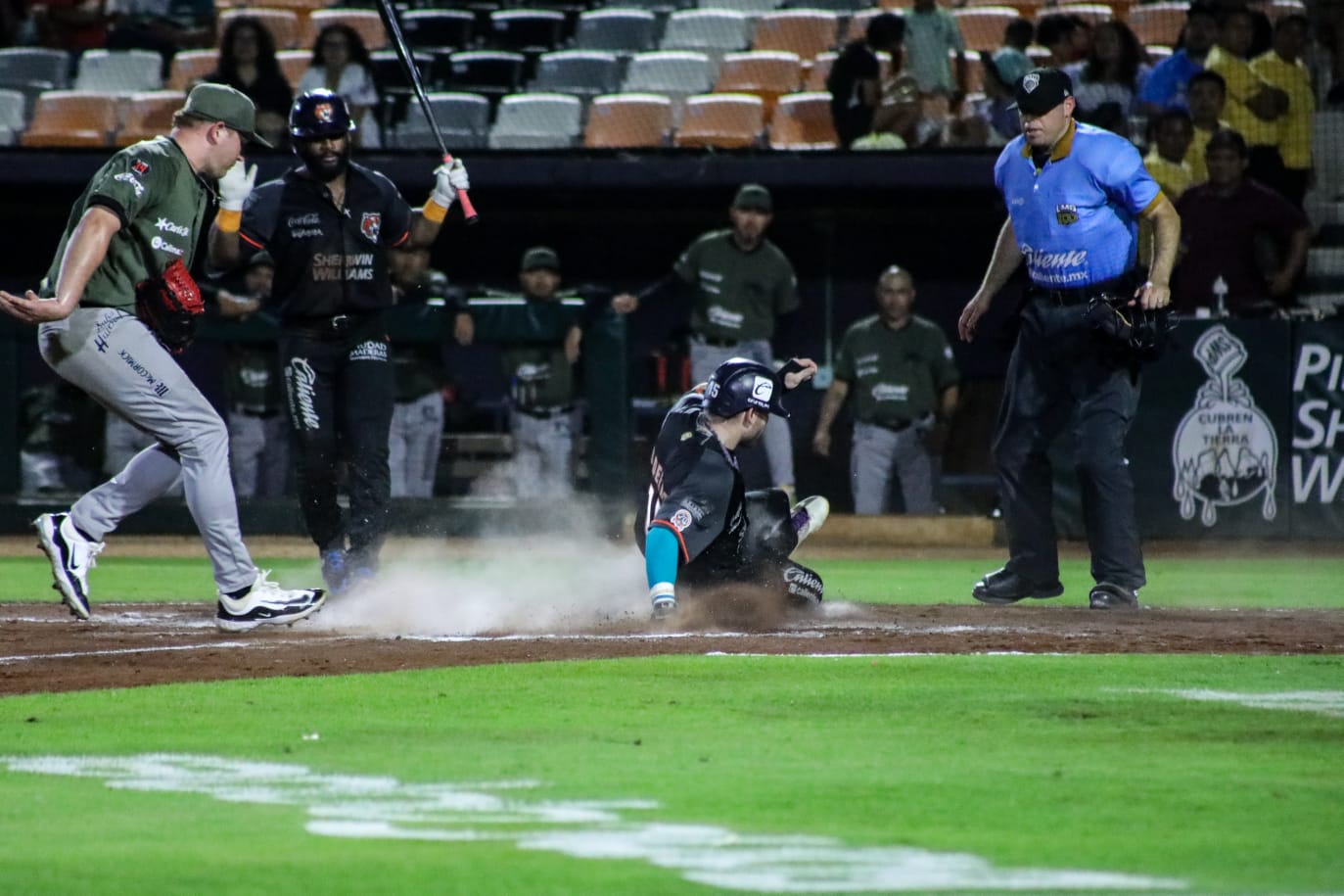 Posteriormente los fronterizos recuperaron la batuta de la batalla en el sexto rollo, al anotar tres rayitas, destacando un cuadrangular de dos carreras de Hernan Pérez (12), por encima de la barda del jardín izquierdo.