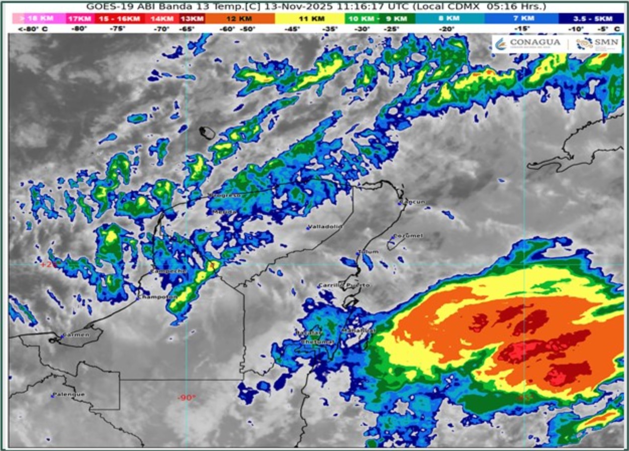 CHETUMAL, 13 de noviembre.- El Servicio Meteorológico Nacional (SMN) mantiene un pronóstico de lluvias torrenciales este jueves para Quintana Roo, principalmente en el sur del estado, por efecto de la interacción entre un canal de baja presión que se extiende sobre el occidente del Mar Caribe y el ingreso de humedad e inestabilidad atmosférica.