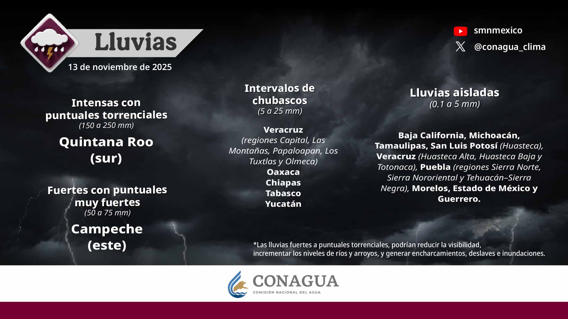 Dichas condiciones originarán lluvias puntuales torrenciales con posibles trombas marinas en Quintana Roo, principalmente en el sur, así como lluvias muy fuertes en Campeche y chubascos en Yucatán.