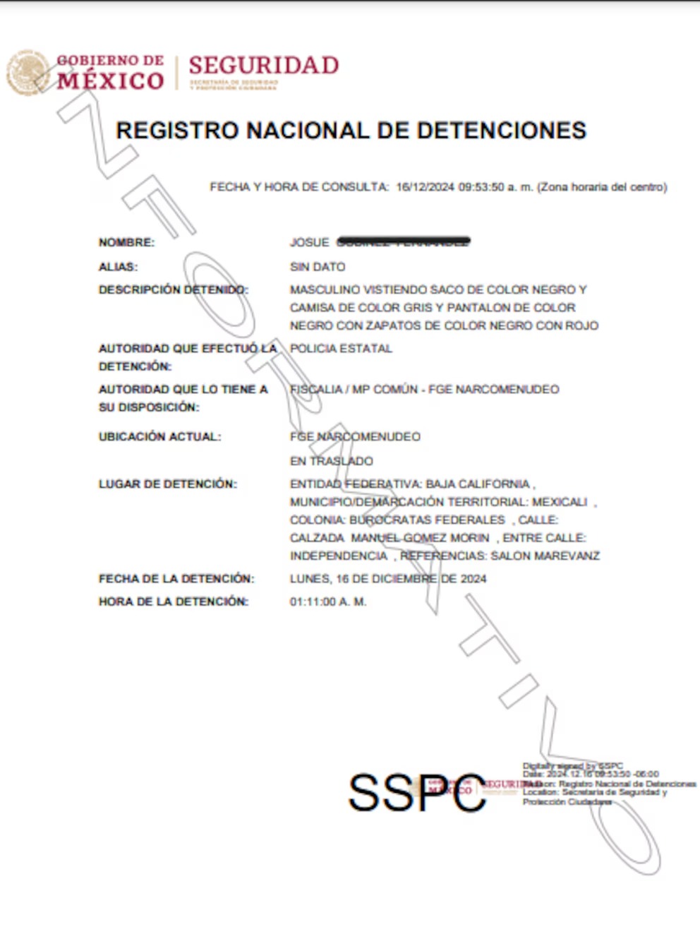 Al hacerle una revisión, le aseguraron una credencial con el nombre de Oliver Ernesto Vázquez y otra con su verdadero nombre. Ambas contaban con la misma fotografía, por lo que la primera resultó ser falsa. Además, los oficiales encontraron que la bolsa que arrojó al suelo contenía cerca de 14 gramos de cocaína.
