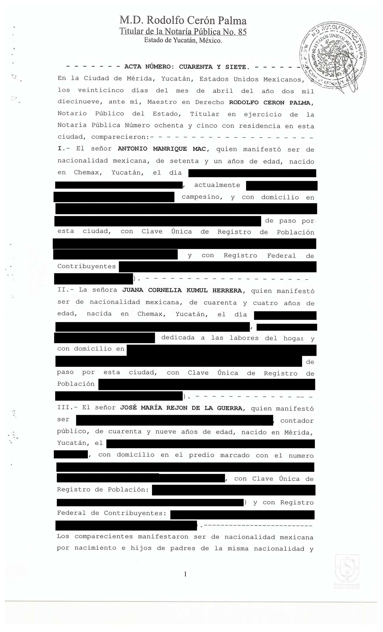 Bajo amenazas, lo subieron a un vehículo y lo llevaron por la fuerza a una notaría en Mérida, Yucatán, en la notaría (la No.85 de Yucatán, a cargo del notario Rodolfo Cerón Palma), le hicieron firmar documentos sin permitirle leer ni explicarle plenamente su contenido.