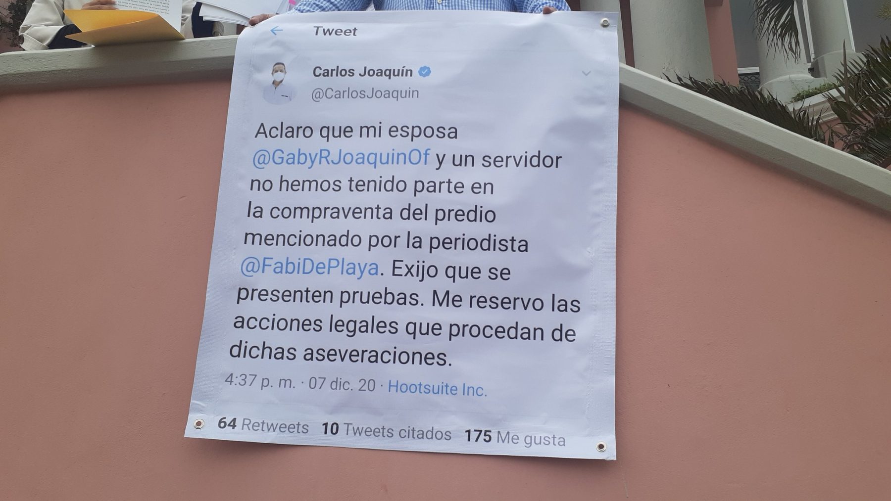 En respuesta, el entonces gobernador Carlos Joaquín desacreditó la acusación alegando que ni él ni su esposa tenían parte en la compraventa, e incluso amenazó con acciones legales contra la denunciante, no emprendió tales acciones, pero desató una campaña de persecución mediática y judicial contra la abogada-periodista que destapó la verdad.