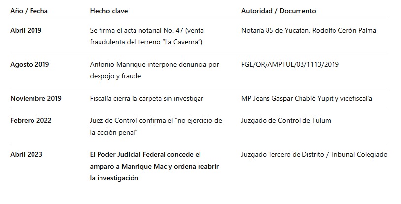 Con ello quedó firme la orden, se revoca el “no ejercicio” dictado por la Fiscalía en 2019 y se reabre la carpeta de investigación FGE/QR/AMPTUL/08/2019, ahora por mandato judicial, un juez local deberá convocar audiencia y reexaminar el caso, esta vez garantizando que Antonio Manrique tenga asesoría jurídica y voz en el proceso, algo que le fue negado originalmente, esto abre la posibilidad real de un proceso penal contra José María Rejón de la Guerra y todos los involucrados en el despojo.