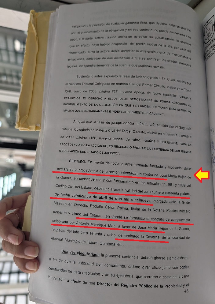 Aquí el juez anula oficialmente la escritura o acta notarial número 47, que fue firmada el 25 de abril de 2019. Esa acta fue el documento mediante el cual José María Rejón de la Guerra se adjudicó el terreno conocido como “La Caverna”, propiedad original de Antonio Manrique Mac.