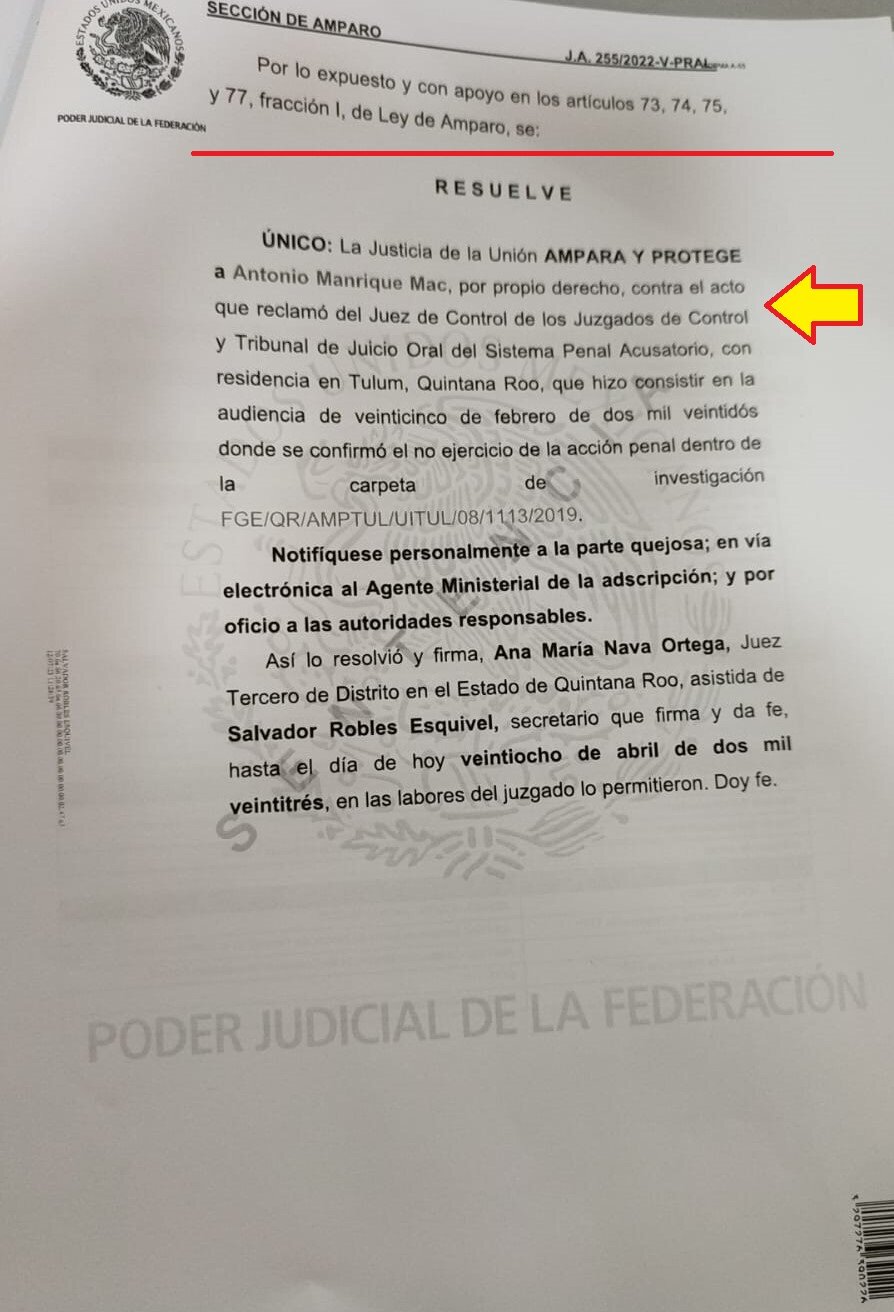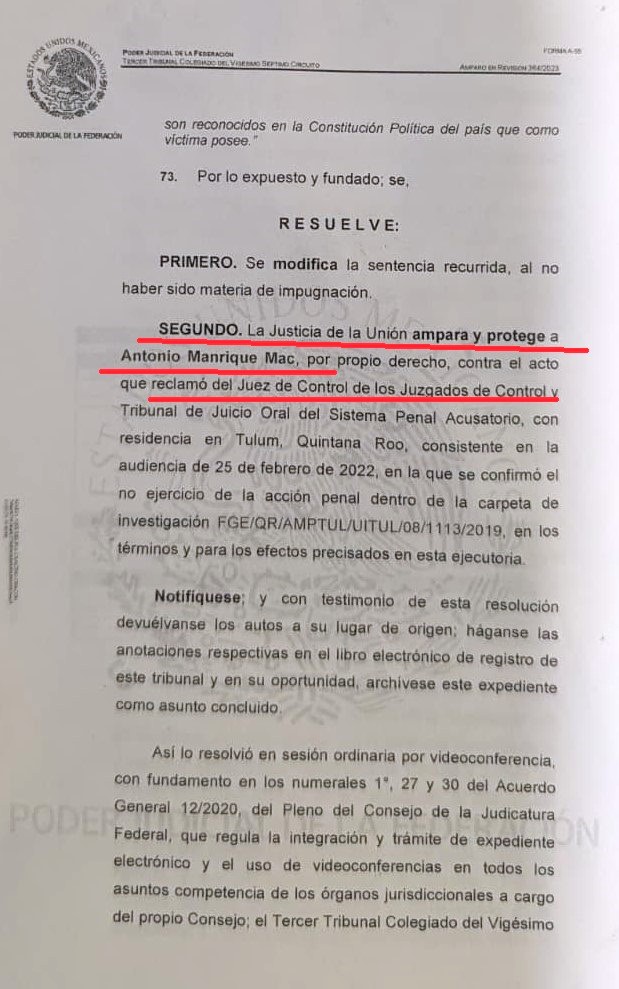 En diciembre de 2021, el Juzgado Tercero de Distrito en Cancún falló a favor de Antonio otorgándole un amparo que ordenaba reponer el procedimiento.