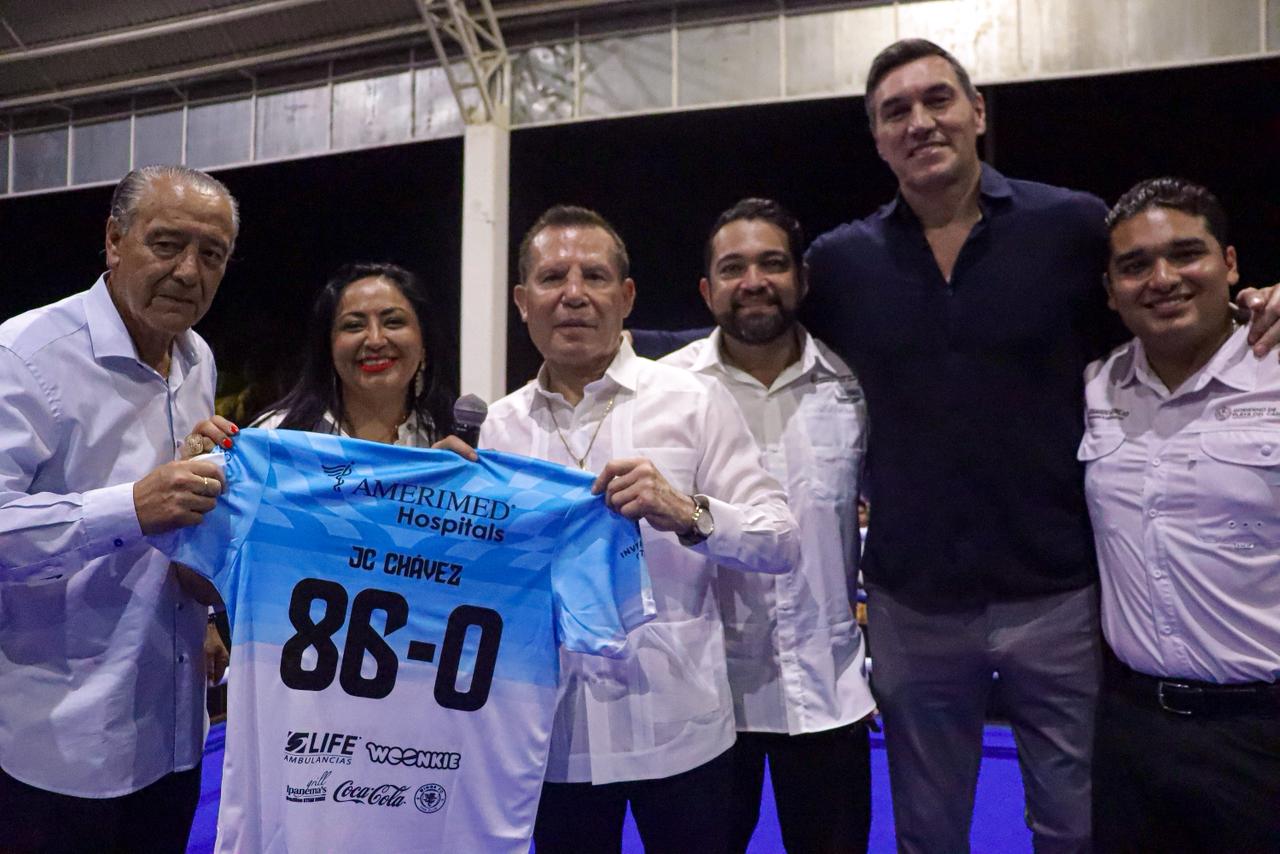 Playa del Carmen, Quintana Roo a 21 de noviembre del 2025.- En un ambiente de júbilo y emotividad, este jueves la presienta del Inter Playa del Carmen, Patricia Fajardo reconoció al gran campeón de boxeo Julio César Chávez y le entregó una camiseta con su nombre y el número 86-0, récord que estableció al haber obtenido, en una etapa de su carrera, igual número de victorias consecutivas sin derrota.