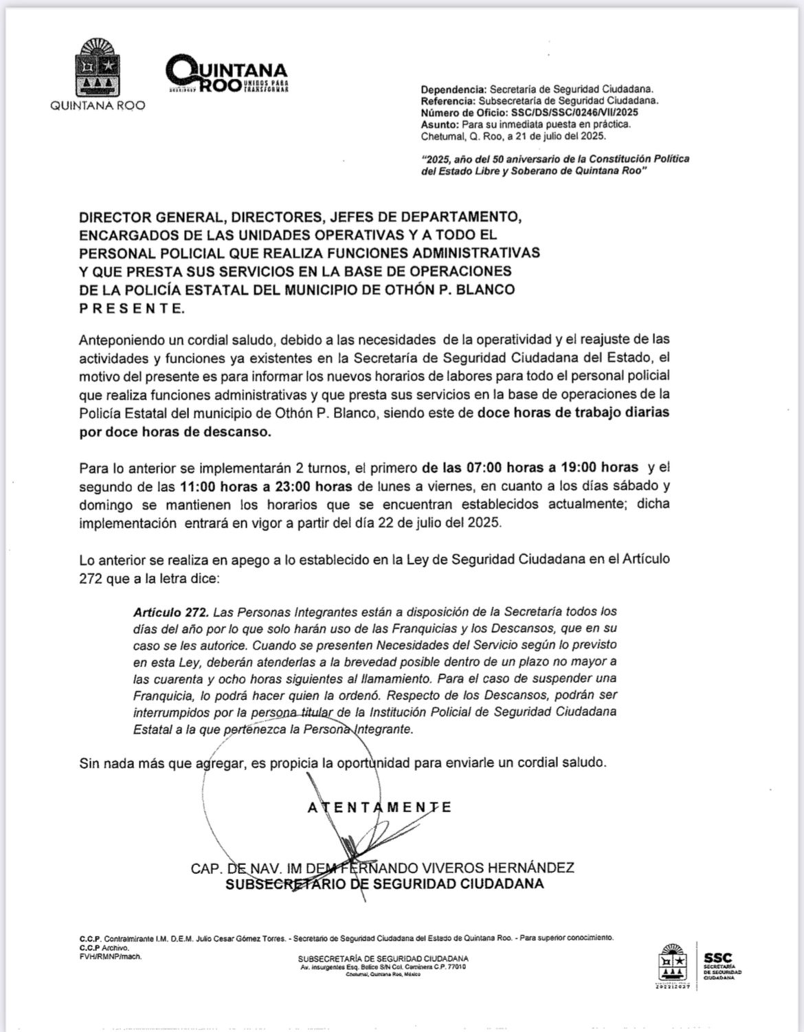 CHETUMAL, 22 de julio. – En un movimiento esclavista que detonó la indignación dentro de las filas de la Secretaría de Seguridad Ciudadana del Estado de Quintana Roo, con el aval del capitán de navío Julio Cesar Gómez Torres titular de la dependencia, a partir del 22 de julio se impusieron nuevas disposiciones laborales que son calificadas por el propio personal como “un retroceso alarmante en derechos laborales” y un claro reflejo del endurecimiento autoritario derivado de la militarización de la corporación. La orden, firmada por el subsecretario Fernando Viveros Hernández, establece turnos de hasta 12 horas diarias para personal administrativo y condiciones aún más severas para personal operativo.