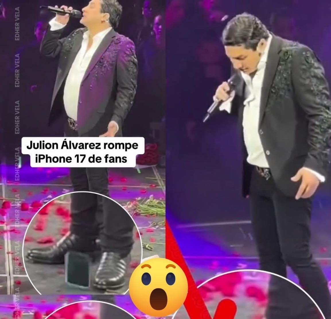 Fue entonces cuando Julión da un pisotón justamente arriba del celular que segundos antes había sido lanzado por uno de sus seguidores, al darse cuenta de lo que había hecho, el rostro del cantante se mostró asombrado y un tanto apenado, sin embargo, Álvarez siguió con el concierto de manera habitual.