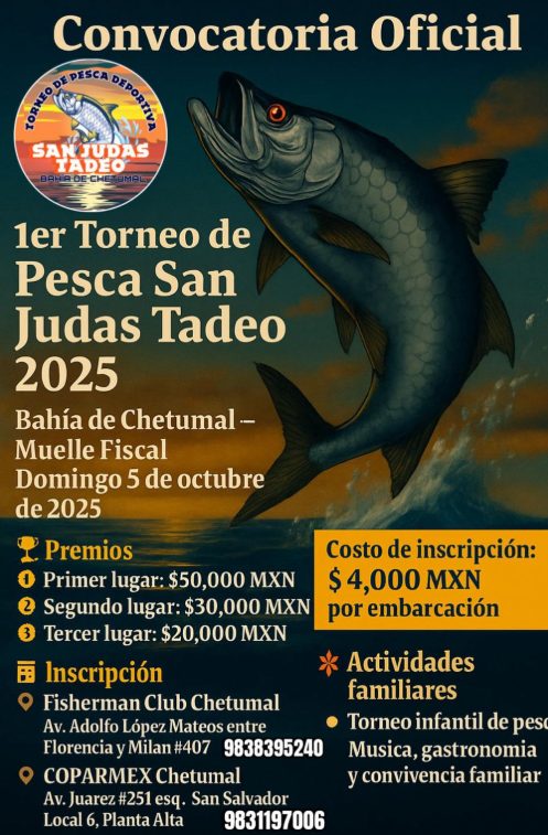 CHETUMAL, 1 de octubre. La bahía de Chetumal se alista para ser escenario del 1er Torneo de Pesca San Judas Tadeo 2025, que se celebrará el próximo domingo 5 de octubre con sede en el Muelle Fiscal.