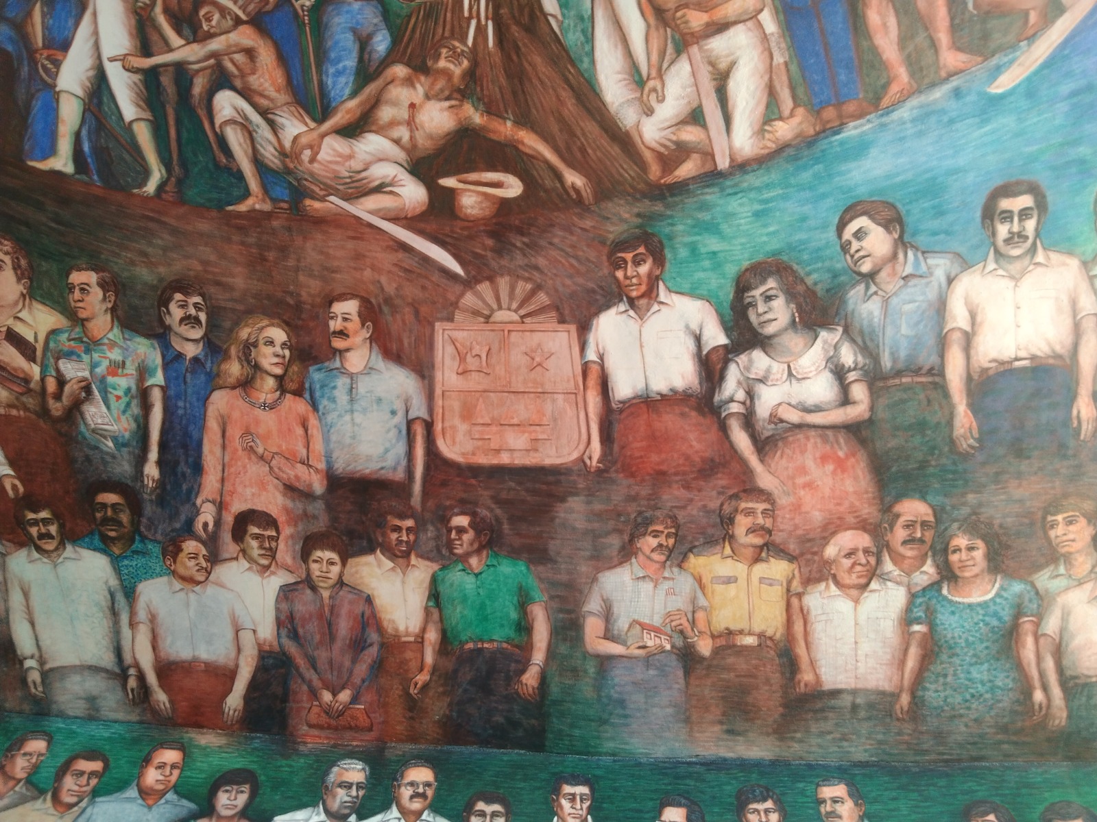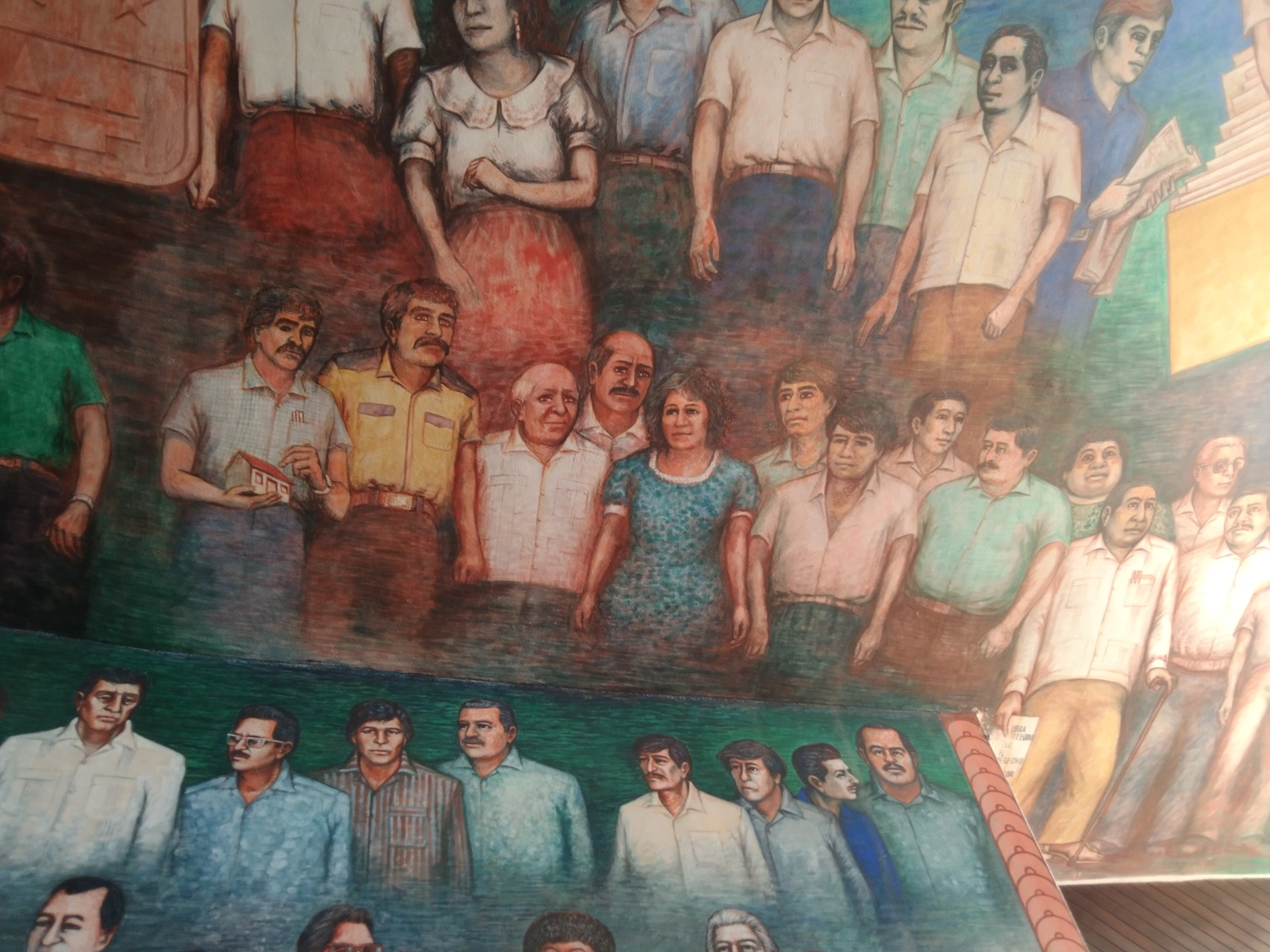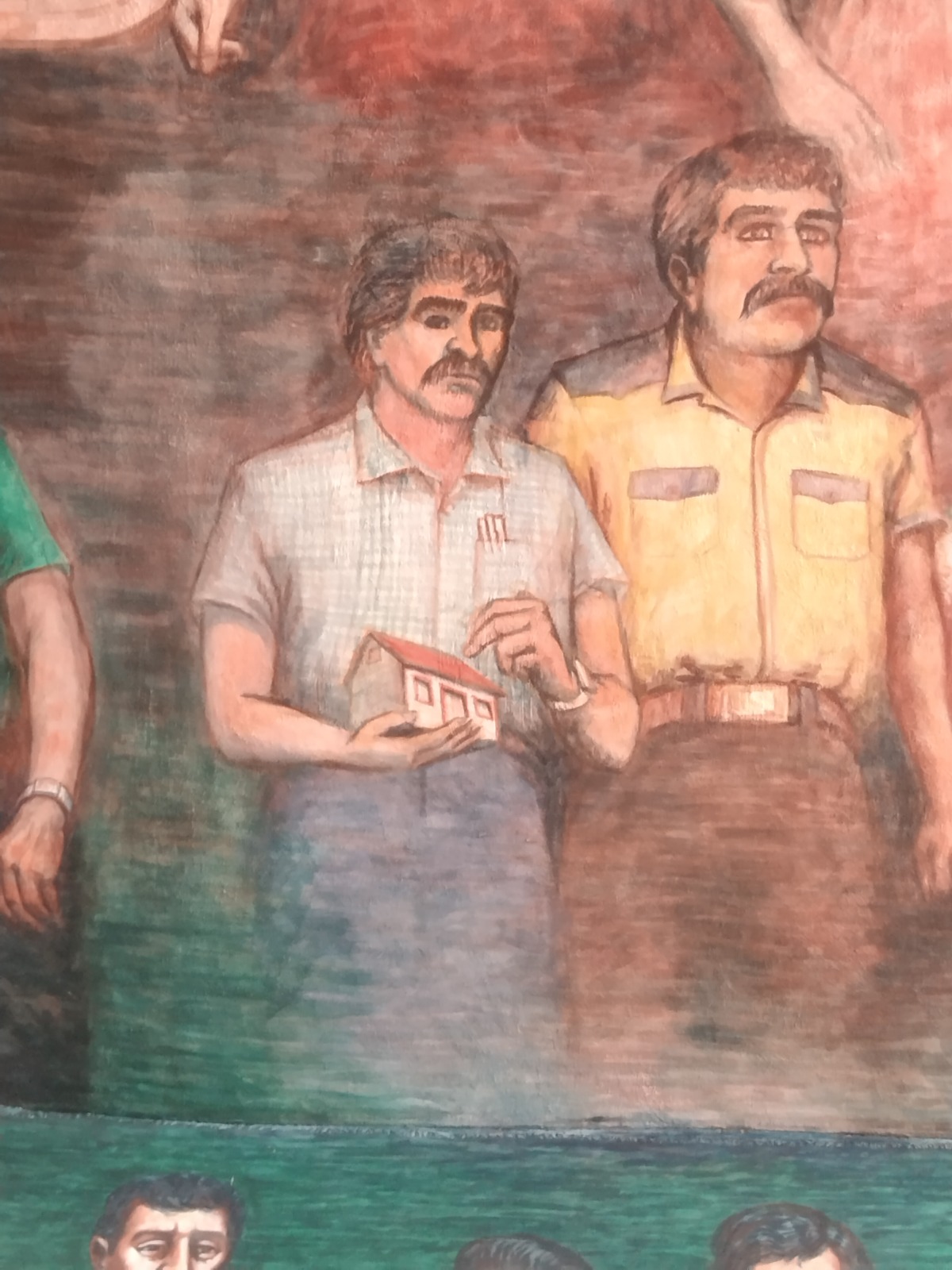 Hoy les quiero contar sobre un dibujo del mural que tiene su larga historia, si te paras al centro del lobby y observas hacia el ventanal que da hacia las oficinas, en la parte de arriba de esa ventana, podrás observar los retratos de los diputados que integraron las legislaturas correspondientes, en un retrato aparece un personaje sosteniendo con su mano una casita, bueno de ese pedacito de mural es la historia escondida de mi bello Chetumal.