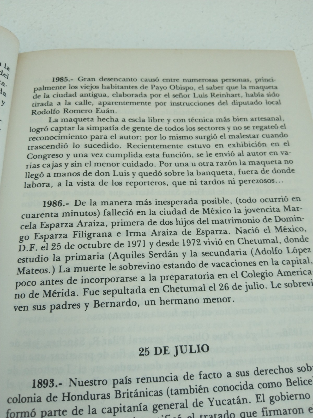 “1985: Gran desencanto causó entre numerosas personas, principalmente entre los viejos habitantes de Payo Obispo, el saber que la maqueta de la ciudad antigua, elaborada por el señor Luis Reinhard había sido tirada a la calle, aparentemente por instrucciones del diputado local Rodolfo Romero Euán”.