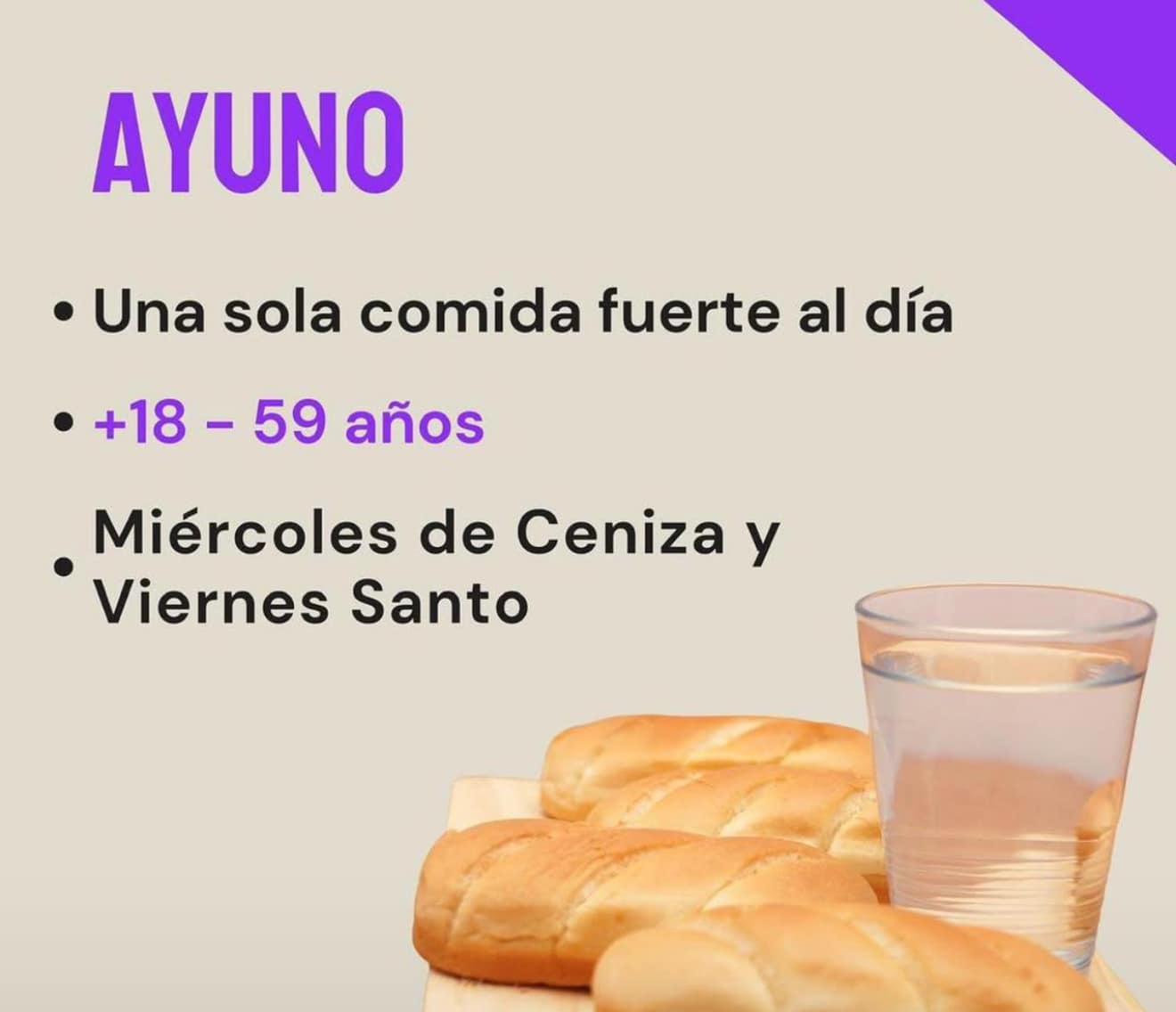 El ayuno es obligado el Miércoles de Ceniza, al igual que el Viernes Santo, a los mayores de 18 años y menores de 60 y consiste en hacer solo una comida fuerte al día.