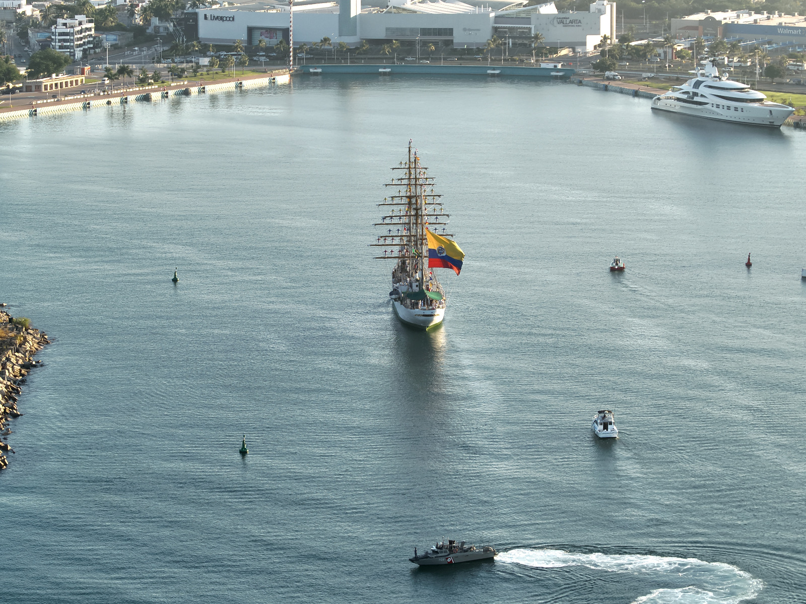 Con 154 tripulantes a bordo -70 de ellos Cadetes en formación de la Escuela Naval de Suboficiales de Cartagena-, el ARC “Gloria” fue recibido por autoridades del estado de Jalisco y del municipio de Puerto Vallarta, como símbolo de hermandad entre Colombia y México.