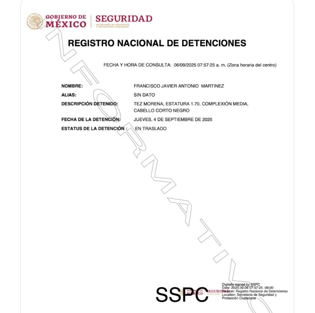 Francisco Javier Antonio Martínez fue detenido por las autoridades federales el pasado jueves 4 de septiembre. La ficha de detención no específica dónde se le detuvo.