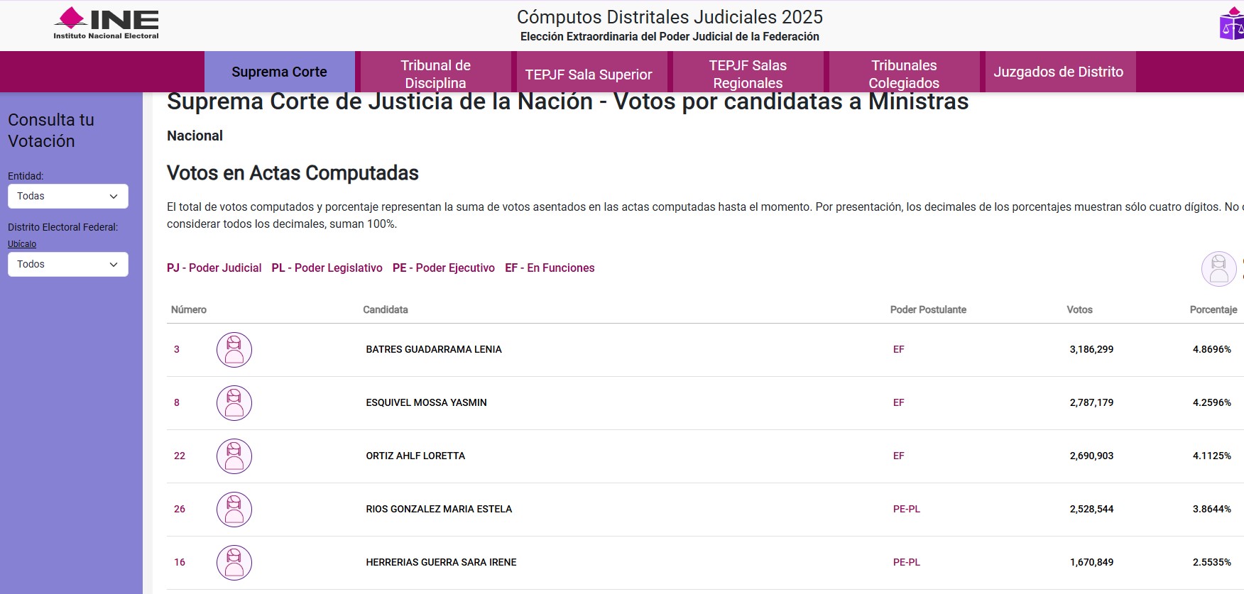 Por otra parte, con el avance del 63 % de las casillas computadas en el país, la tendencia es que serán ministras de la SCJN Lenia Batres Guadarrama, Yasmín Esquivel Mossa, Loretha Ortiz Ahlf, María Estela Ríos Gonzáles y Sara Irene Herrerías Guerra.