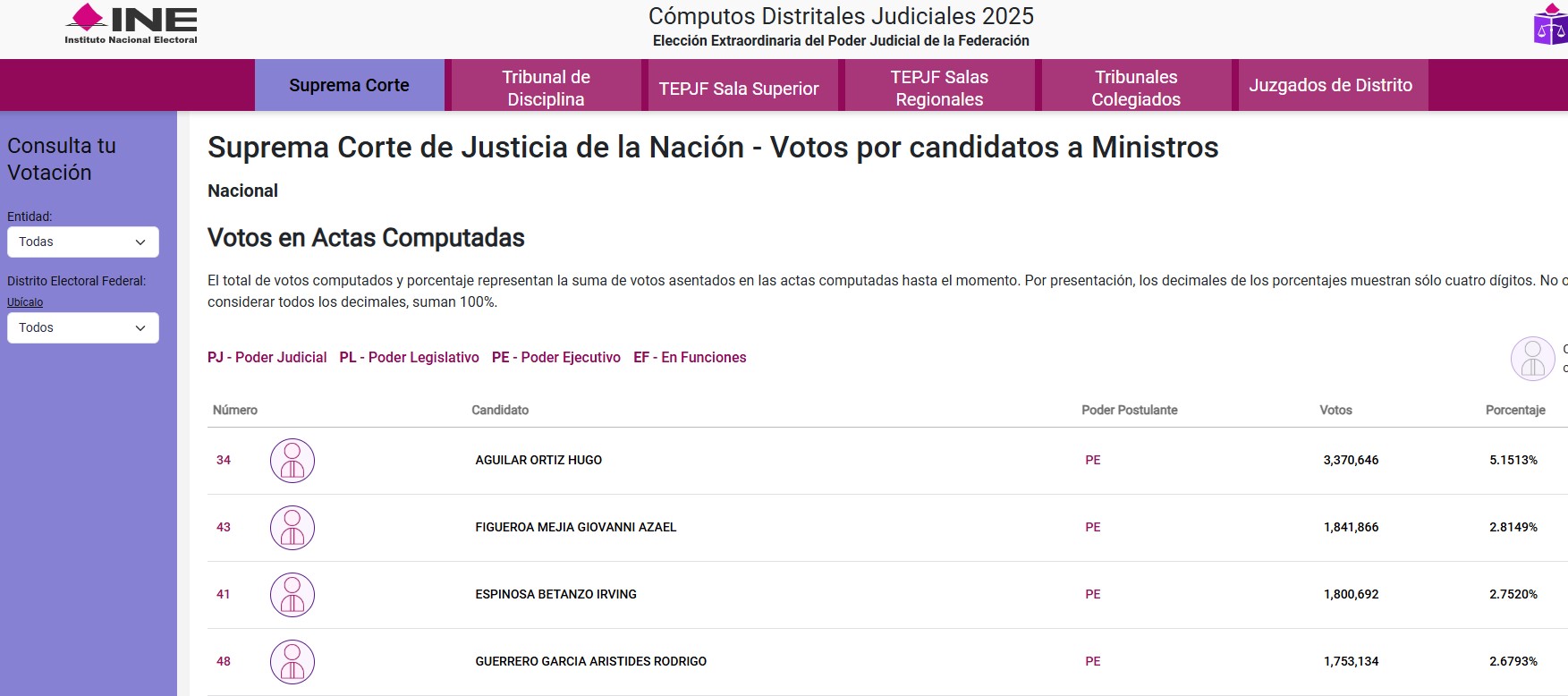 A nivel nacional, en la contienda por la presidencia de la SCJN puntea el oaxaqueño Hugo Aguilar Ortiz, a quien la 4T promueve como “el Juárez moderno”, con 5.12 % de la votación, seguido en segundo lugar por Lenia Batres Guadarrama, con 4.85 % de la votación a su favor.