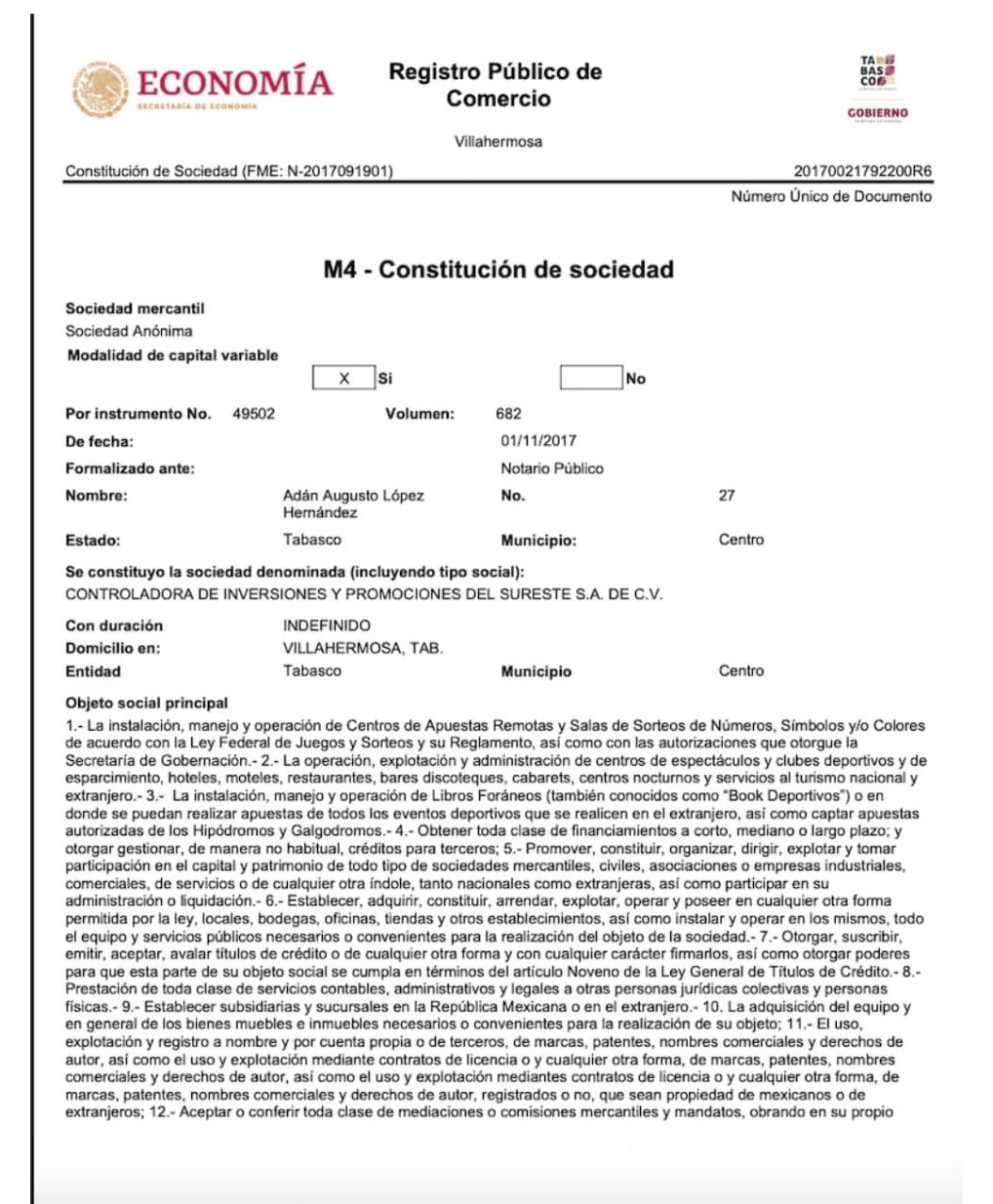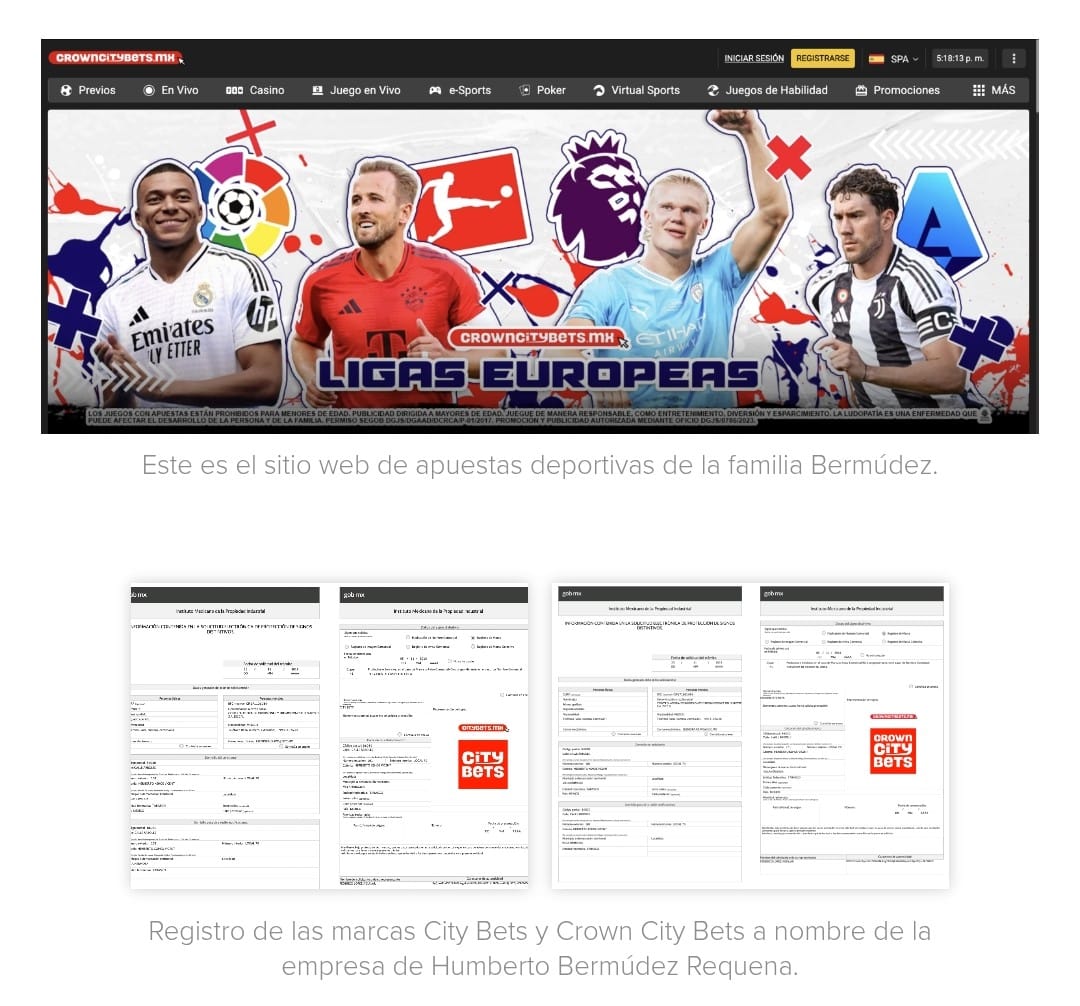 Humberto Bermúdez está relacionado con las plataformas digitales de apuestas CrownCity y CityBets, las cuales son manejadas por la empresa Controladora de Inversiones y Promociones del Sureste SA de CV, constituida en noviembre de 2017 ante una notaría en Villahermosa vinculada a Adán Augusto López, entonces notario público en funciones.