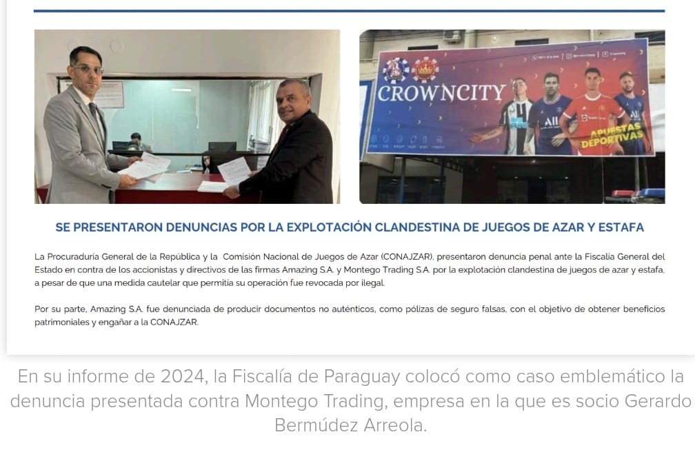 Antes de esa resolución, en abril de 2025, el fiscal Marcelo Saldívar había presentado una imputación contra Bermúdez Arreola y sus socios en la firma paraguaya Montego Trading SA, relacionada con la operación del sitio web crowncityplay.com.py, el cual presuntamente funcionaba fuera del marco legal de ese país.