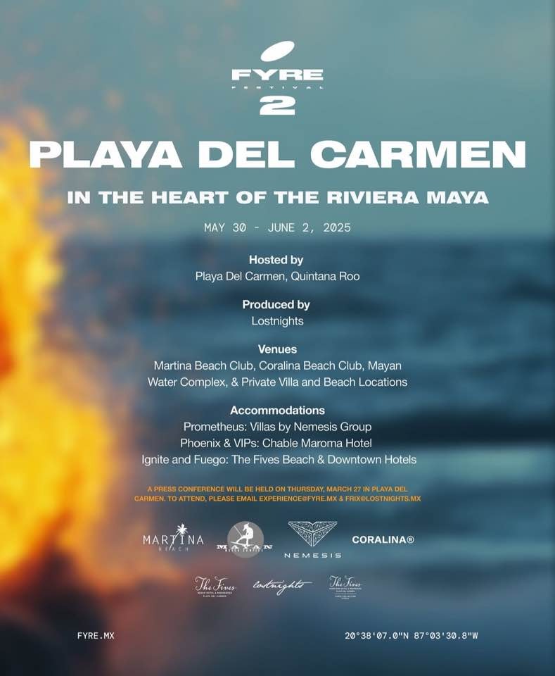 ISLA MUJERES, Q.ROO, 21 de marzo-. Como el estafador Billy McFarland no pudo engatusar a las autoridades de Isla Mujeres con su fantasioso Fyre Fest 2, intenta ahora estafar al gobierno de Playa del Carmen con el supuesto festival que, según la promoción, se llevará a cabo del 30 de mayo al 02 de junio.