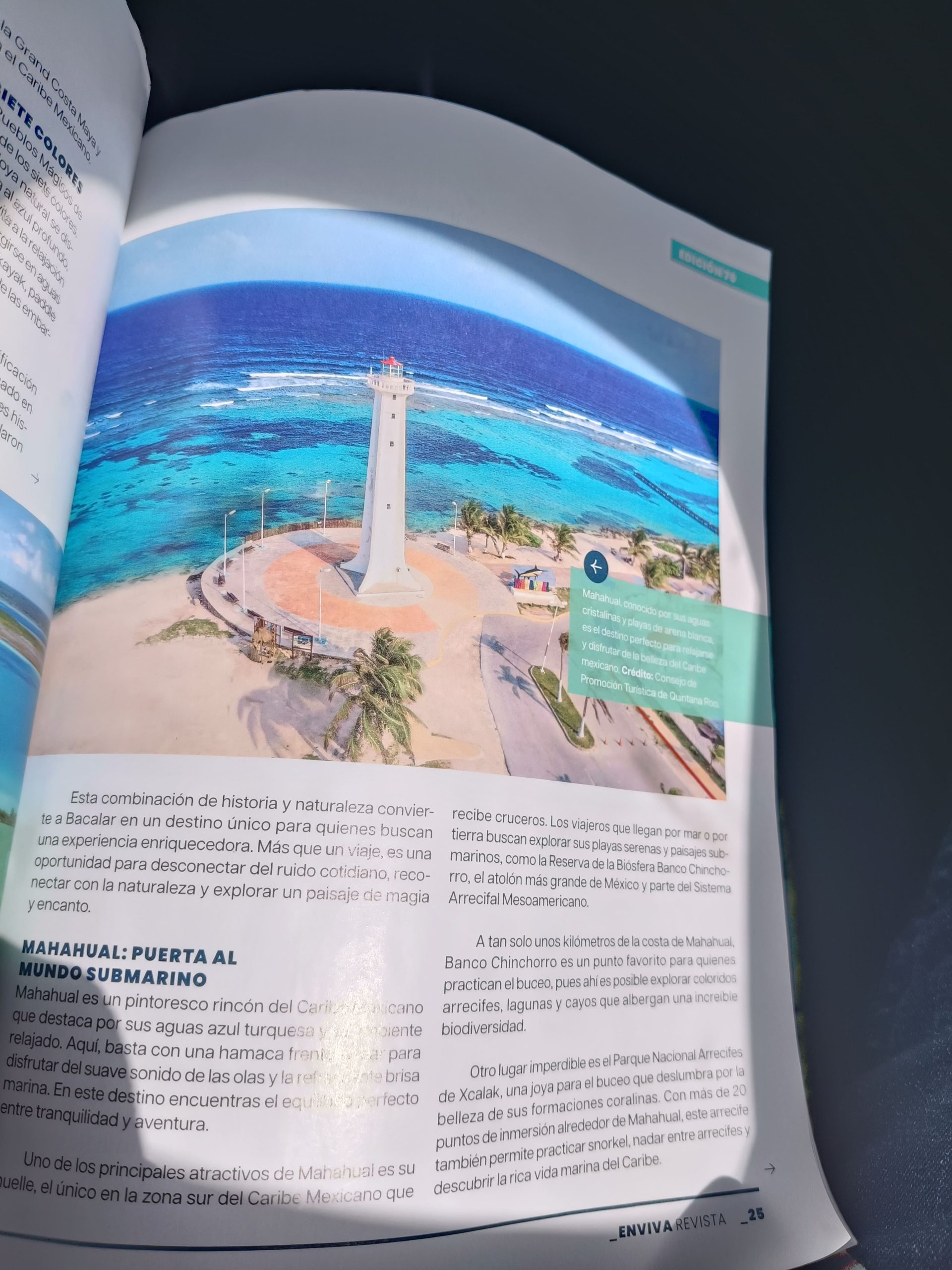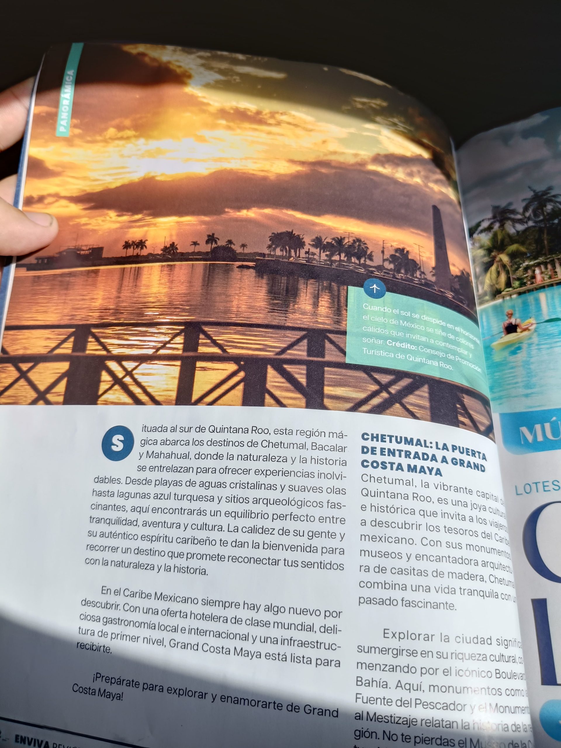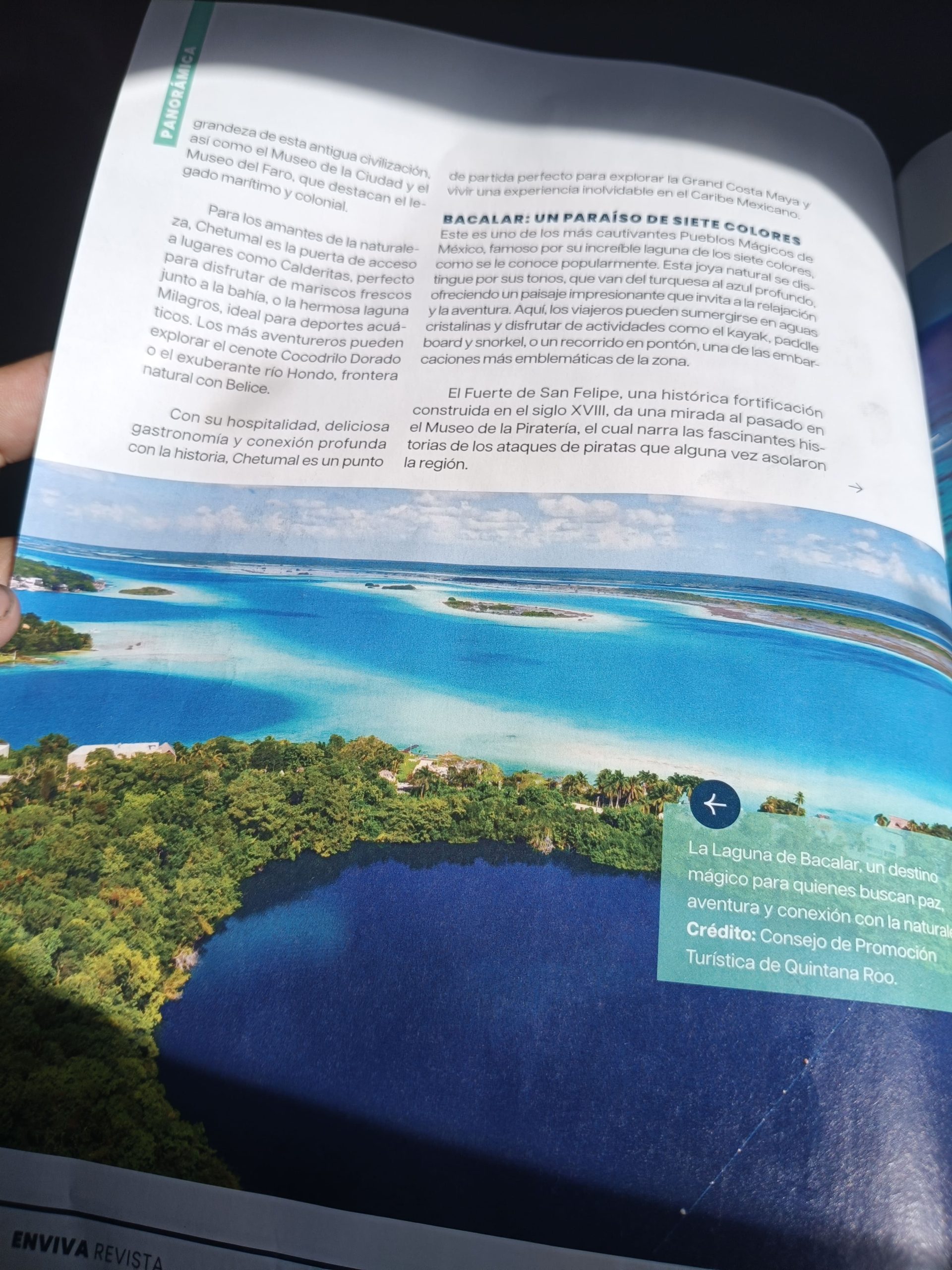 BACALAR, 3 de enero. La riqueza natural y cultural de la Grand Costa Maya ha sido destacada en la edición más reciente de la revista de a bordo de la aerolínea Viva Aerobus, llevando los destinos de Chetumal, Bacalar y Majahual a miles de viajeros nacionales e internacionales. Esta estrategia de promoción representa una ventana importante para impulsar el turismo en la región.