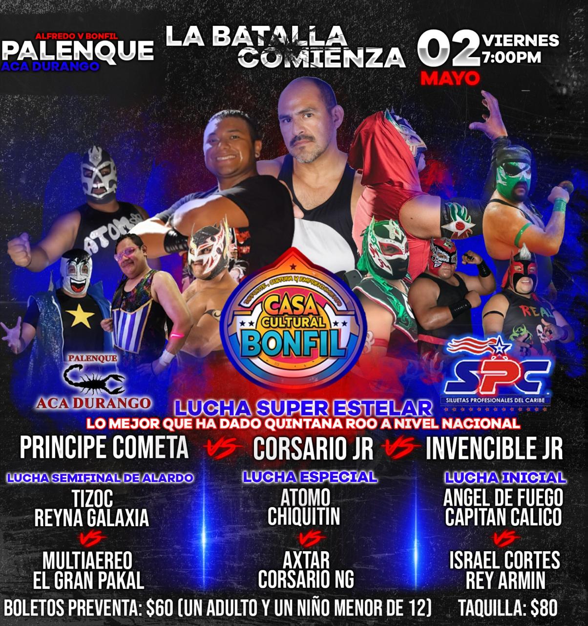 Es así como Siluetas Promociones del Caribe, junto a Casa Cultural Bonfil, llevarán este viernes 2 de mayo la Lucha Libre al ejido, en una función avalada por la H. Comisión de Box, Lucha Libre y Artes Marciales Mixtas de Benito Juárez, que preside Florentino López.
